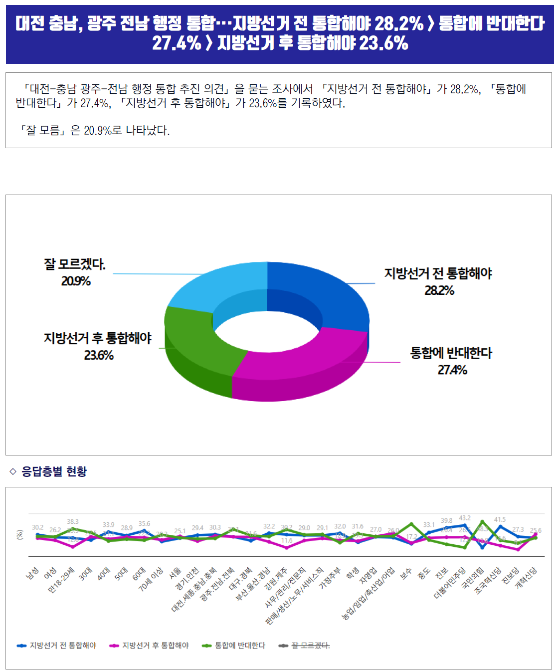 ´ëÀü-Ãæ³² ±¤ÁÖ-Àü³² ÇàÁ¤ ÅëÇÕ ÃßÁø Àǰߡ¤¡¤¡¤Áö¹æ¼±°Å Àü ÅëÇÕÇØ¾ß 28.2% > ÅëÇÕ¿¡ ¹Ý´ëÇÑ´Ù 27.4% > Áö¹æ¼±°Å ÈÄ ÅëÇÕÇØ¾ß 23.6%