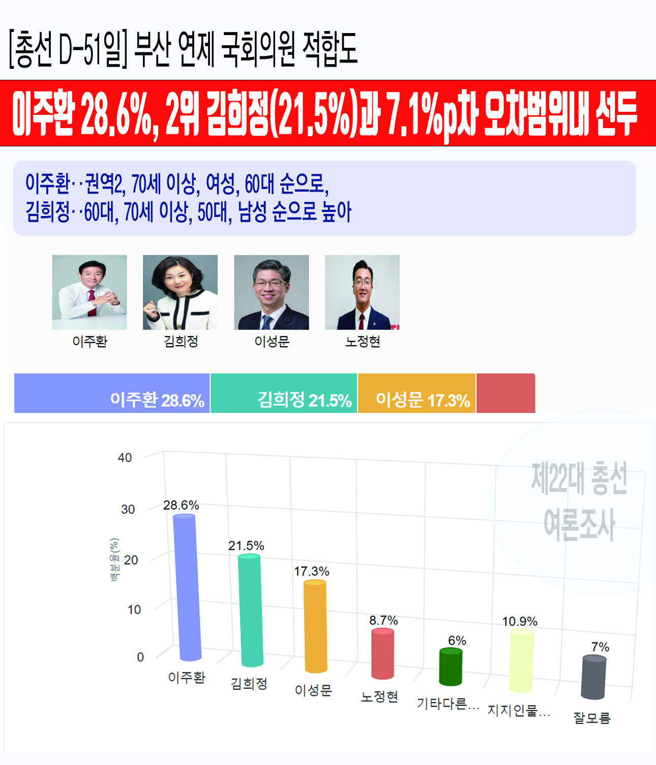 [ÃѼ± D-51ÀÏ] ºÎ»ê ¿¬Á¦ ±¹È¸ÀÇ¿ø¡¤¡¤¡¤ÀÌÁÖȯ 28.6%, 2À§ ±èÈñÁ¤(21.5%)°ú 7.1%pÂ÷ ¿ÀÂ÷¹üÀ§³» ¼±µÎ