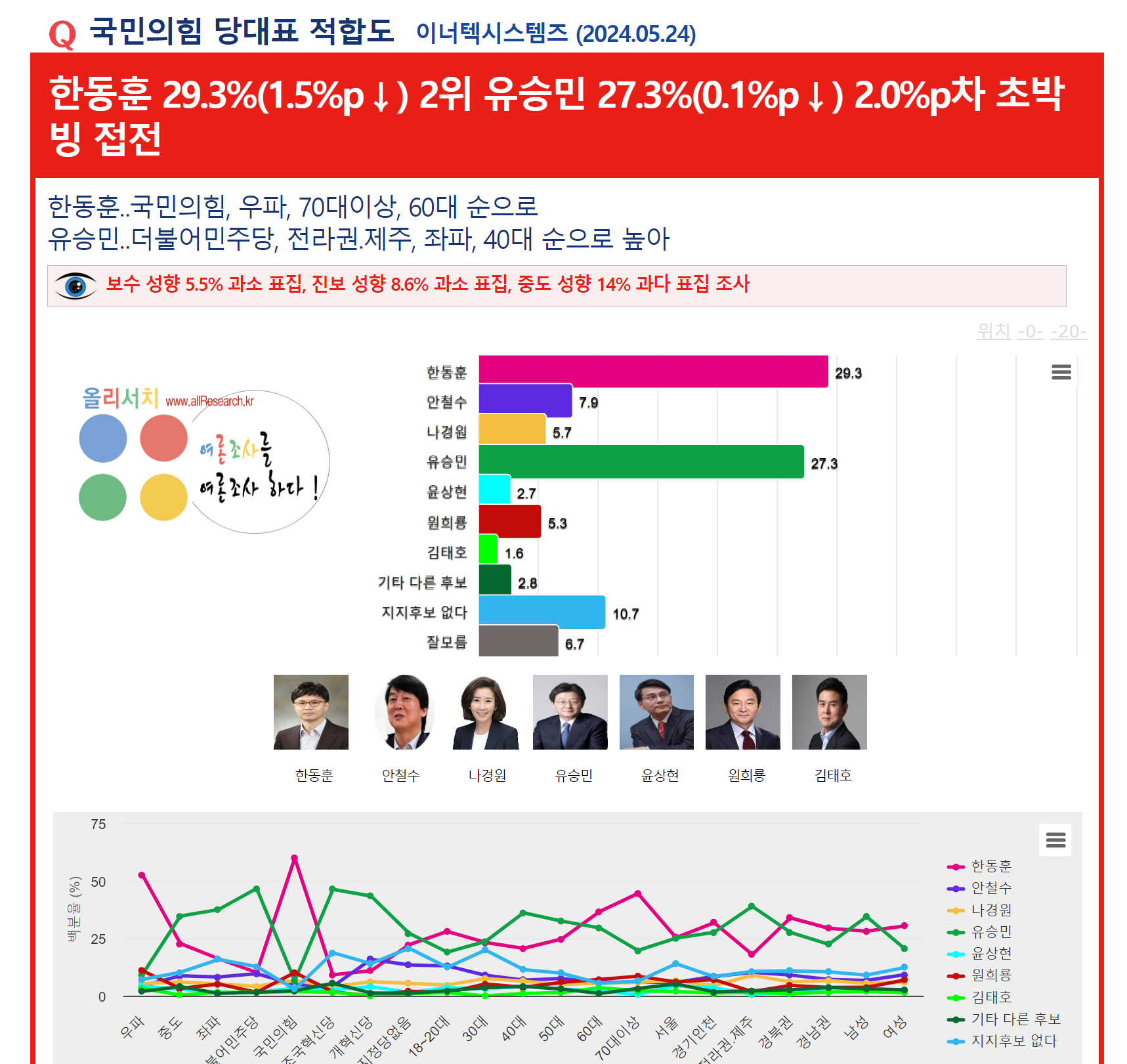 À̹ø Á¶»ç´Â Á÷Àü Á¶»ç(2024.05.17,À̳ÊÅØ½Ã½ºÅÛÁî)¿Í´Â ´Þ¸® ÁöÁöÀ²ÀÇ º¯È¸¦ º¸¿©ÁÖ°í ÀÖ´Ù.¹Ý´ë·Î ¡¸Çѵ¿ÈÆ¡¹ È帴 Á÷Àü Á¶»ç ´ëºñ 1.5%p(30.8%¡æ29.3%) Ç϶ôÇÏ¿© °¡Àå Å« Ç϶ô¼¼¸¦ º¸¿´´Ù. ÀÌ¾î ¡¸±èÅÂÈ£¡¹ È帴 1.4%p(3.0%¡æ1.6%) Ç϶ô, ¡¸³ª°æ¿ø¡¹ È帴 1.5%p(7.2%¡æ5.7%) Ç϶ôÀ¸·Î ³ª¿Ô´Ù.