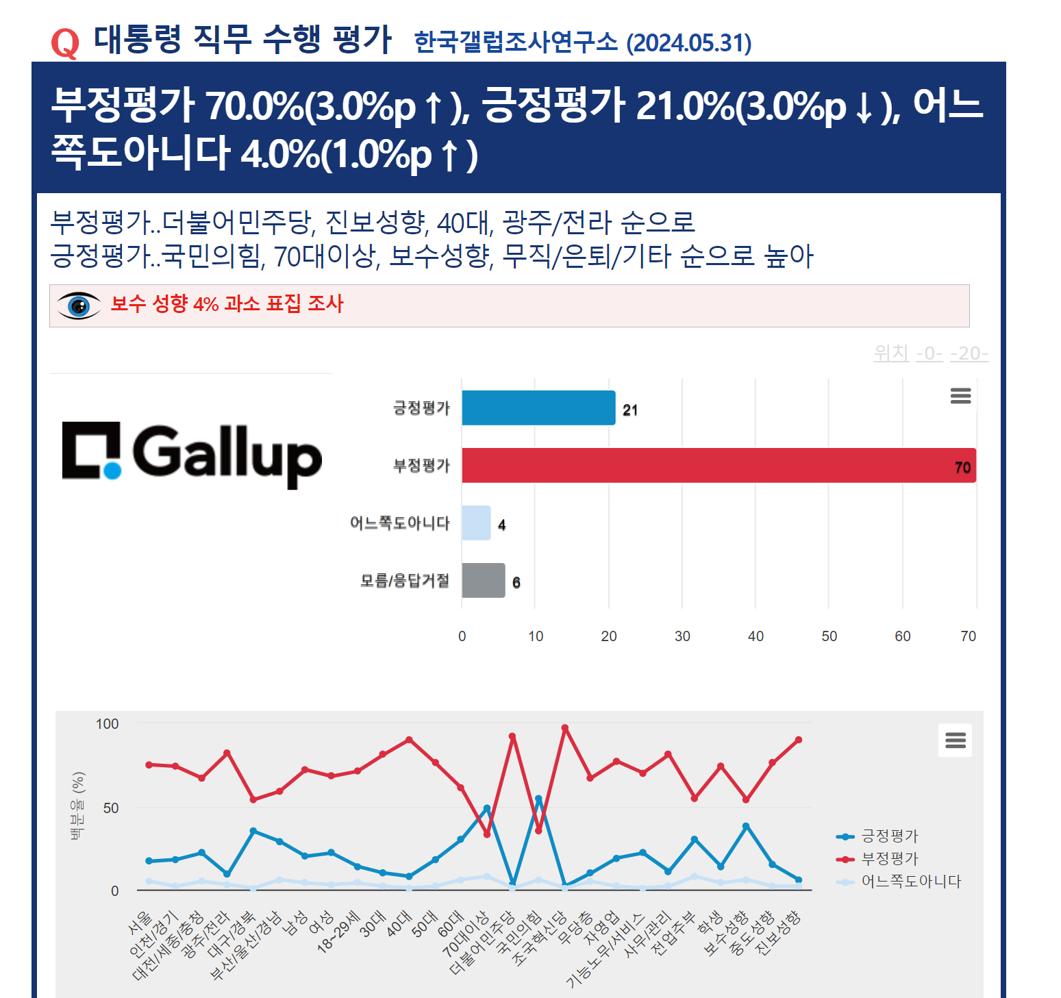 ¡¸±àÁ¤Æò°¡¡¹´Â "70´ëÀÌ»ó" ¿¬·ÉÃþ, "±¹¹ÎÀÇÈû" ÁöÁöÃþ¿¡¼ ¡¸ºÎÁ¤Æò°¡¡¹¸¦ 10%p ÀÌ»ó Å« Â÷ÀÌ·Î µûµ¹¸®¸ç ³ôÀº ÀÀ´äÀ» º¸¿´´Ù.¡ÝÁ÷ÀüÁ¶»ç ºñ±³ »ó¼¼ ¿¶÷ ÆîÄ¡±â¢Å