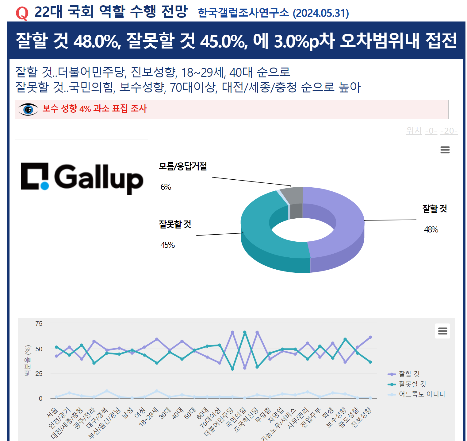 Á¶»ç±â°ü Çѱ¹°¶·´Á¶»ç¿¬±¸¼Ò°¡ 5¿ù 28ÀÏ¿¡¼ 30ÀϱîÁö »çÈê°£ ½Ç½ÃÇÏ¿© 31ÀÏ ¹ßÇ¥ÇÑ ¡¸22´ë ±¹È¸ ¿ªÇÒ ¼öÇà Àü¸Á¡¹¸¦ ¹¯´Â Á¶»ç¿¡¼ ¡¸ÀßÇÒ °Í¡¹ÀÌ 48%¸¦ ±â·ÏÇÏ¿© 2À§ ¡¸À߸øÇÒ °Í¡¹(45%)¿¡ 3%p Â÷ÀÌ·Î ¾Õ¼ ³ª°¡¸ç, µÚ¸¦ ÀÌ¾î ¡¸¾î´ÀÂʵµ ¾Æ´Ï´Ù¡¹°¡ 1%¸¦ ±â·ÏÇÏ¿´´Ù.