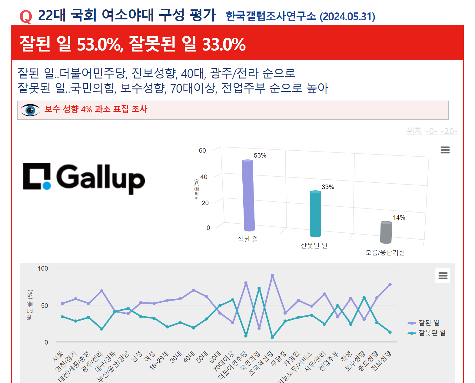 Á¶»ç±â°ü Çѱ¹°¶·´Á¶»ç¿¬±¸¼Ò°¡ 5¿ù 28ÀÏ¿¡¼ 30ÀϱîÁö »çÈê°£ ½Ç½ÃÇÏ¿© 31ÀÏ ¹ßÇ¥ÇÑ ¡¸22´ë ±¹È¸ ¿©¼Ò¾ß´ë ±¸¼º Æò°¡¡¹¸¦ ¹¯´Â Á¶»ç¿¡¼ ¡¸ÀßµÈ ÀÏ¡¹ÀÌ 53%¸¦ ±â·ÏÇÏ¿© 2À§ ¡¸À߸øµÈ ÀÏ¡¹(33%)¿¡ 20%p Â÷ÀÌ·Î ¾Õ¼ ³ª°¡´Â °ÍÀ¸·Î ³ªÅ¸³µ´Ù.