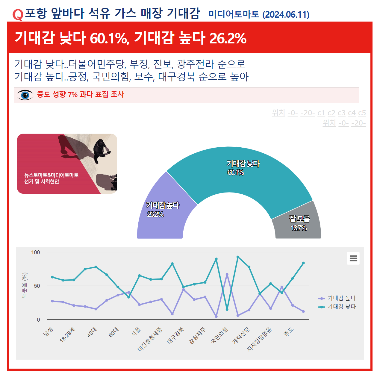 Á¶»ç±â°ü ¹Ìµð¾îÅ丶Åä°¡ 6¿ù 8ÀÏ¿¡¼ 9ÀϱîÁö ÀÌÆ²°£ ½Ç½ÃÇÏ¿© 11ÀÏ ¹ßÇ¥ÇÑ ¡¸Æ÷Ç× ¾Õ¹Ù´Ù ¼®À¯ °¡½º ¸ÅÀå ±â´ë°¨¡¹¸¦ ¹¯´Â Á¶»ç¿¡¼ ¡¸±â´ë°¨ ³·´Ù¡¹°¡ 60.1%¸¦ ±â·ÏÇÏ¿© 2À§ ¡¸±â´ë°¨ ³ô´Ù¡¹(26.2%)¿¡ 33.9%p Â÷ÀÌ·Î ¾Õ¼ ³ª°¡´Â °ÍÀ¸·Î ³ªÅ¸³µ´Ù.