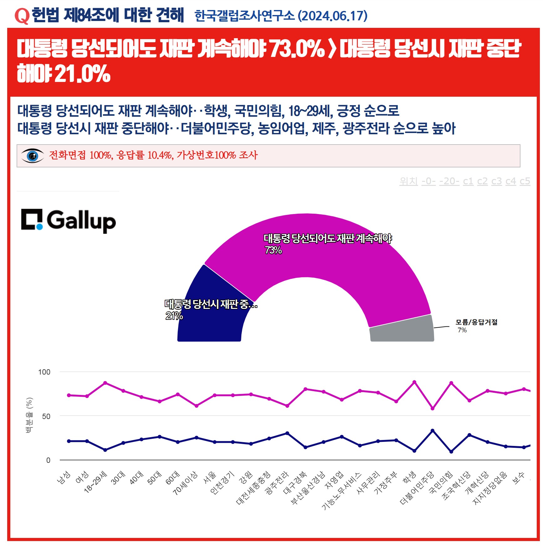 ¡¸Çå¹ý Á¦84Á¶¿¡ ´ëÇÑ °ßÇØ¡¹¿©·ÐÁ¶»ç¿¡¼ '´ëÅë·É ´ç¼±µÇ¾îµµ ÀçÆÇ °è¼ÓÇØ¾ß'°¡ 73%,'´ëÅë·É ´ç¼±½Ã ÀçÆÇ Áß´ÜÇØ¾ß'°¡ 21%¸¦ ±â·ÏÇß´Ù.