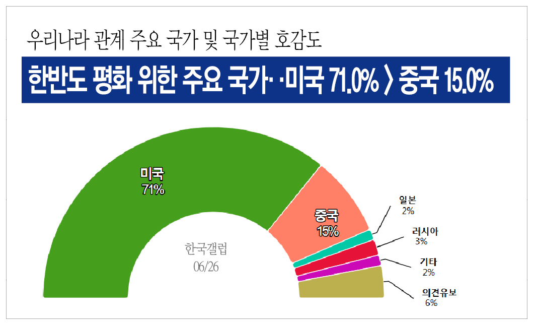Á¶»ç±â°ü Çѱ¹°¶·´Á¶»ç¿¬±¸¼Ò°¡ 6¿ù 25ÀÏ¿¡¼ 27ÀϱîÁö »çÈê°£ ½Ç½ÃÇÏ¿© 28ÀÏ ¹ßÇ¥ÇÑ ¡¸Çѹݵµ ÆòÈ À§ÇÑ °ü°è ÁÖ¿ä ±¹°¡¡¹¸¦ ¹¯´Â Á¶»ç¿¡¼ ¡¸¹Ì±¹¡¹ÀÌ 71%¸¦ ±â·ÏÇÏ¿© 2À§ ¡¸Áß±¹¡¹(15%)¿¡ 56%p Â÷ÀÌ·Î ¾Õ¼ ³ª°¡¸ç, µÚ¸¦ ÀÌ¾î ¡¸·¯½Ã¾Æ¡¹ÀÌ 3%, ¡¸ÀϺ»¡¹ÀÌ 2%¸¦ ±â·ÏÇÏ¿´´Ù.