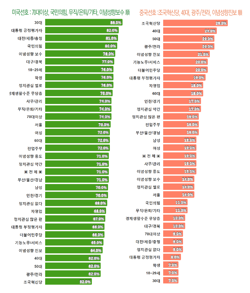 ¡¸¹Ì±¹¡¹´Â(Àº) "30´ë"¿¬·ÉÃþ(86%) "´ëÀü/¼¼Á¾/ÃæÃ»"Áö¿ª(81%) "±¹¹ÎÀÇÈû"ÁöÁöÃþ(80%) "º¸¼ö¼ºÇâ"¼ºÇâ(78%)¿¡¼ ³ô¾Ò°í, ¡¸Áß±¹¡¹´Â(Àº) "40´ë"¿¬·ÉÃþ(24%) "50´ë"¿¬·ÉÃþ(23%) "±¤ÁÖ/Àü¶ó"Áö¿ª(23%) "Áøº¸¼ºÇâ"¼ºÇâ(21%)¿¡¼ »ó´ëÀûÀ¸·Î ³ôÀº °æÀï·ÂÀ» º¸¿´´Ù.