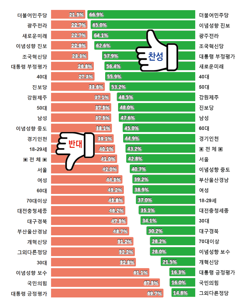 ¡¸Âù¼º¡¹Àº "±¤ÁÖÀü¶ó" Áö¿ª, "°¿øÁ¦ÁÖ" Áö¿ª, "±¹Á¤¿î¿µ-ºÎÁ¤" , "³²¼º" , "40´ë" ¿¬·ÉÃþ, "50´ë" ¿¬·ÉÃþ, "´õºÒ¾î¹ÎÁÖ´ç" ÁöÁöÃþ¿¡¼ 2À§¸¦ Â÷ÁöÇÑ ¡¸¹Ý´ë¡¹¸¦ 10%p ÀÌ»ó Å« Â÷ÀÌ·Î µûµ¹¸®¸ç ³ôÀº ÀÀ´äÀ» º¸¿´´Ù.