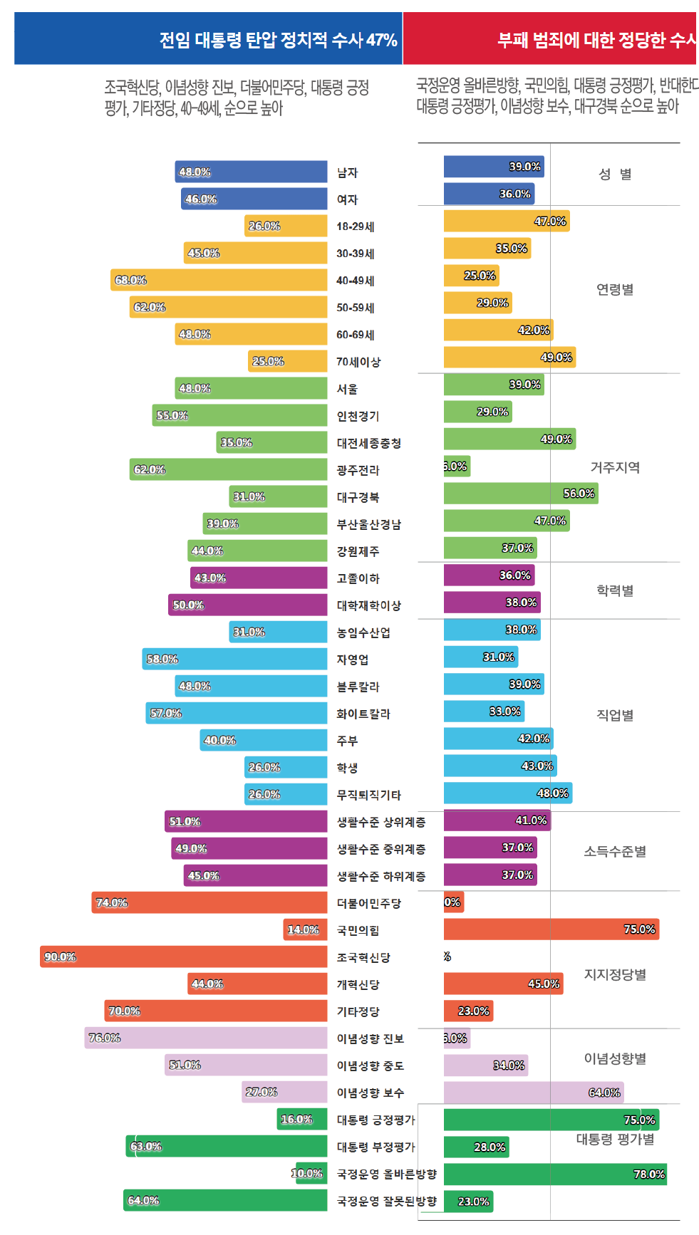 ¡¸ÀüÀÓ ´ëÅë·É ź¾Ð Á¤Ä¡Àû ¼ö»ç¡¹´Â(Àº) "Áøº¸"¼ºÇâ(76%) "´õºÒ¾î¹ÎÁÖ´ç"ÁöÁöÃþ(74%) "±¤ÁÖÀü¶ó"Áö¿ª(62%) "ÀÚ¿µ¾÷"Á÷¾÷±º(58%)¿¡¼ ³ô¾Ò°í, ¡¸ºÎÆÐ ¹üÁË¿¡ ´ëÇÑ Á¤´çÇÑ ¼ö»ç¡¹´Â(Àº) "±¹¹ÎÀÇÈû"ÁöÁöÃþ(75%) "º¸¼ö"¼ºÇâ(64%) "´ë±¸°æºÏ"Áö¿ª(56%) "´ëÀü¼¼Á¾ÃæÃ»"Áö¿ª(49%)¿¡¼ »ó´ëÀûÀ¸·Î ³ôÀº °æÀï·ÂÀ» º¸¿´´Ù.