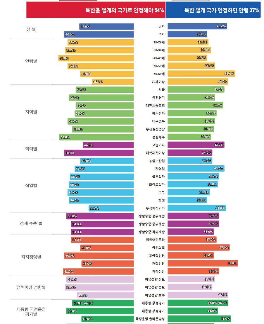 ³²ºÏ °ü°è ¹× ÅëÀÏ Àνġ¥ºÏÇÑÀ» º°°³ÀÇ ±¹°¡·Î ÀÎÁ¤ÇØ¾ß (54.0%) ºÏÇÑ º°°³ ±¹°¡ ÀÎÁ¤ÇÏ¸é ¾ÈµÊ (37.0%)