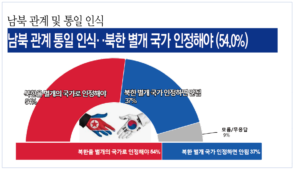 Á¶»ç±â°ü ÄÉÀ̽ºÅȸ®¼­Ä¡°¡ 9¿ù 23ÀÏ¿¡¼­ 25ÀϱîÁö »çÈê°£ ½Ç½ÃÇÏ¿© 26ÀÏ ¹ßÇ¥ÇÑ ¡¸³²ºÏ °ü°è ¹× ÅëÀÏ Àνġ¹¸¦ ¹¯´Â Á¶»ç¿¡¼­ ¡¸ºÏÇÑÀ» º°°³ÀÇ ±¹°¡·Î ÀÎÁ¤Çؾߡ¹ÀÌ 54%¸¦ ±â·ÏÇÏ¿© 2À§ ¡¸ºÏÇÑ º°°³ ±¹°¡ ÀÎÁ¤ÇÏ¸é ¾ÈµÊ¡¹(37%)¿¡ 17%p Â÷ÀÌ·Î ¾Õ¼­ ³ª°¡´Â °ÍÀ¸·Î ³ªÅ¸³µ´Ù.