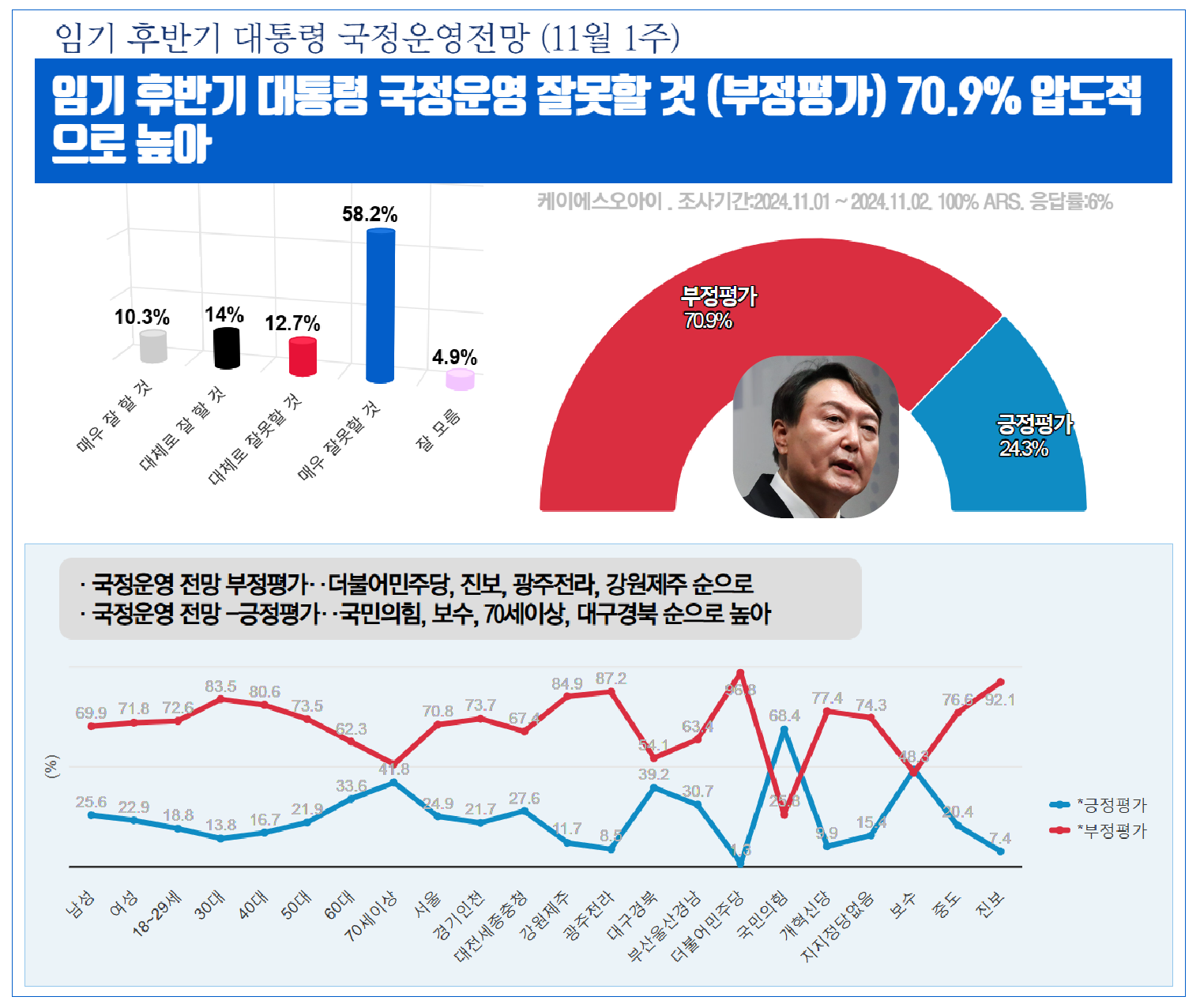 Á¶»ç±â°ü ÄÉÀÌ¿¡½º¿À¾ÆÀÌ ÁÖ½Äȸ»ç(Çѱ¹»çȸ¿©·Ð¿¬±¸¼Ò)°¡ 11¿ù 1ÀÏ¿¡¼­ 2ÀϱîÁö ÀÌÆ²°£ ½Ç½ÃÇÏ¿© 4ÀÏ ¹ßÇ¥ÇÑ ¡¸ÀÓ±â ÈĹݱ⠴ëÅë·É ±¹Á¤¿î¿µÀü¸Á¡¹Á¶»ç¿¡¼­ '¸Å¿ì Àß ÇÒ °Í'¿Í '´ëü·Î Àß ÇÒ °Í'¸¦ ÇÕÇÑ ¡¸±àÁ¤Æò°¡¡¹´Â 24.3%À̸ç, '´ëü·Î À߸øÇÒ °Í'¿Í '¸Å¿ì À߸øÇÒ °Í'¸¦ ÇÕÇÑ ¡¸ºÎÁ¤Æò°¡¡¹´Â 70.9%·Î ³ª¿Ô´Ù.