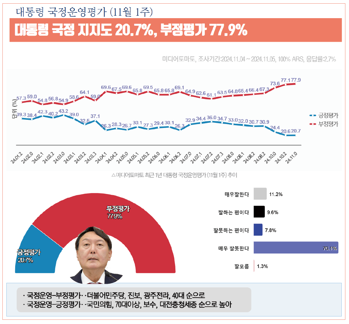 Á¶»ç±â°ü ¹Ìµð¾îÅ丶Åä°¡ 11¿ù 4ÀÏ¿¡¼ 5ÀϱîÁö ÀÌÆ²°£ ½Ç½ÃÇÏ¿© 7ÀÏ ¹ßÇ¥ÇÑ ¡¸´ëÅë·É ±¹Á¤¿î¿µÆò°¡¡¹Á¶»ç¿¡¼ '¸Å¿ìÀßÇÑ´Ù'¿Í 'ÀßÇÏ´Â ÆíÀÌ´Ù'¸¦ ÇÕÇÑ ¡¸±àÁ¤Æò°¡¡¹´Â 20.8%À̸ç, 'À߸øÇÏ´Â ÆíÀÌ´Ù'¿Í '¸Å¿ì À߸øÇÑ´Ù'¸¦ ÇÕÇÑ ¡¸ºÎÁ¤Æò°¡¡¹´Â 77.9%·Î ³ª¿Ô´Ù.