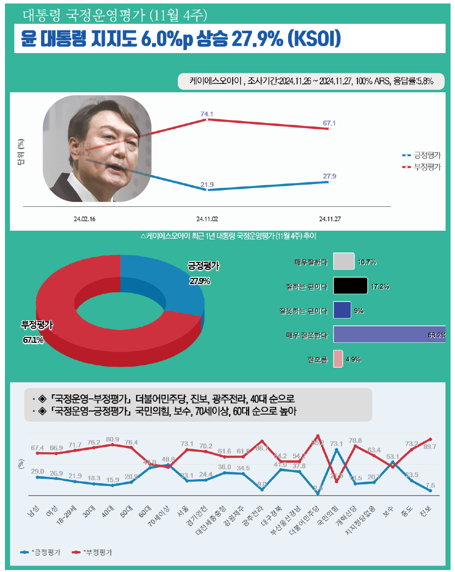 Á¶»ç±â°ü ÄÉÀÌ¿¡½º¿À¾ÆÀÌ ÁÖ½Äȸ»ç(Çѱ¹»çȸ¿©·Ð¿¬±¸¼Ò)°¡ 11¿ù 26ÀÏ¿¡¼ 27ÀϱîÁö ÀÌÆ²°£ ½Ç½ÃÇÏ¿© 29ÀÏ ¹ßÇ¥ÇÑ ¡¸´ëÅë·É ±¹Á¤¿î¿µÆò°¡¡¹Á¶»ç¿¡¼ '¸Å¿ìÀßÇÑ´Ù'¿Í 'ÀßÇÏ´Â ÆíÀÌ´Ù'¸¦ ÇÕÇÑ ¡¸±àÁ¤Æò°¡¡¹´Â 27.9%À̸ç, 'À߸øÇÏ´Â ÆíÀÌ´Ù'¿Í '¸Å¿ì À߸øÇÑ´Ù'¸¦ ÇÕÇÑ ¡¸ºÎÁ¤Æò°¡¡¹´Â 67.2%·Î ³ª¿Ô´Ù.