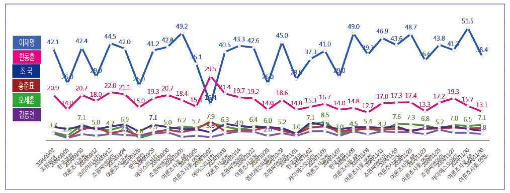 Áö³ 3ÀÏ À± ´ëÅë·ÉÀÇ ºñ»ó°è¾ö ¼±Æ÷ ÈÄ 2024³â 12¿ù 5ÀÏ ~ 2024³â 12¿ù 10ÀÏ ±â°£¿¡ ½Ç½ÃµÈ ÃÑ 9°Ç(ÀüÈ ¸éÁ¢¿ø 4°Ç, ARS 5°Ç)ÀÇ ¡¸Â÷±â´ë¼±´ÙÀÚ±¸µµ¡¹Á¶»ç¿¡¼ 'ÀÌÀç¸í'Àº ÃÖ°í 52.4%~ÃÖÀú 29%(Æò±Õ 43.9%) 'Çѵ¿ÈÆ'Àº ÃÖ°í 12.9%~ÃÖÀú 7%(Æò±Õ 9.6%) '¿À¼¼ÈÆ'Àº ÃÖ°í 7.4%~ÃÖÀú 2%(Æò±Õ 5.1%) 'È«ÁØÇ¥'Àº ÃÖ°í 6.1%~ÃÖÀú 3%(Æò±Õ 4.9%) 'Á¶±¹'Àº ÃÖ°í 7.7%~ÃÖÀú 4%(Æò±Õ 6.1%) '±èµ¿¿¬'Àº ÃÖ°í 4.4%~ÃÖÀú 2%(Æò±Õ 3.4%)ÀÇ ÁöÁöÀ²À» º¸¿´´Ù.
