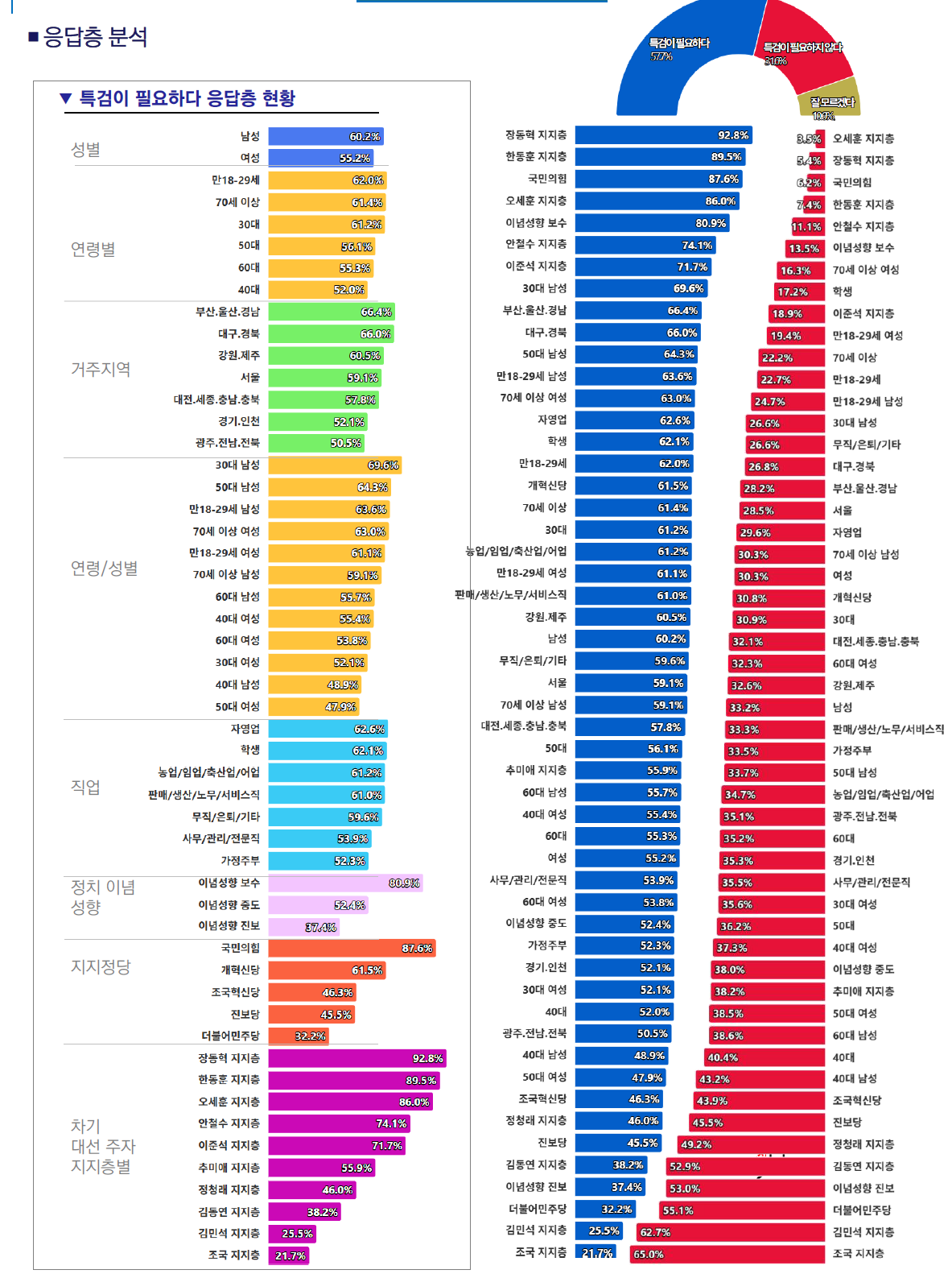 ¡¸Æ¯°ËÀÌ ÇÊ¿äÇÏ´Ù¡¹´Â ±¹¹ÎÀÇÈû ÁöÁöÃþ(87.6%) º¸¼ö ÀÀ´äÃþ(80.9%) ºÎ»ê.¿ï»ê.°æ³² (66.4%) ´ë±¸.°æºÏ (66%) ÀÚ¿µ¾÷ Á÷¾÷±º(62.6%)¿¡¼ ³ô¾Ò°í, ¡¸Æ¯°ËÀÌ ÇÊ¿äÇÏÁö ¾Ê´Ù¡¹´Â ´õºÒ¾î¹ÎÁÖ´ç ÁöÁöÃþ(55.1%) Áøº¸ ÀÀ´äÃþ(53%) Á¶±¹Çõ½Å´ç ÁöÁöÃþ(43.9%) 40´ë ¿¬·ÉÃþ(40.4%) Áßµµ ÀÀ´äÃþ(38%)¿¡¼ »ó´ëÀûÀ¸·Î ³ô°Ô ³ªÅ¸³µ´Ù.