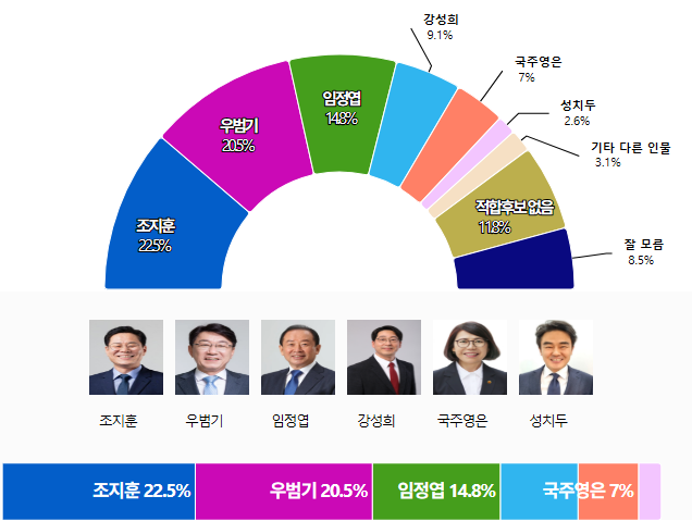 Á¶»ç±â°ü Á¶¿ø¾¾¾Ø¾ÆÀ̰¡ 12¿ù 27ÀÏ¿¡¼ 28ÀϱîÁö ÀÌÆ²°£ ½Ç½ÃÇÏ¿© 2ÀÏ ¹ßÇ¥ÇÑ ¡¸Àü¶óºÏµµ ÀüÁÖ½ÃÀå Èĺ¸ÀûÇÕµµ¡¹¸¦ ¹¯´Â Á¶»ç¿¡¼ ¡¸Á¶ÁöÈÆ¡¹È帰¡ 22.5%¸¦ ±â·ÏÇÏ¿© 2À§ ¡¸¿ì¹ü±â¡¹Èĺ¸(20.5%)¿¡ 2%p Â÷ÀÌ·Î ¾Õ¼ ³ª°¡¸ç, µÚ¸¦ ÀÌ¾î ¡¸ÀÓÁ¤¿±¡¹Èĺ¸ 14.8%, ¡¸°¼ºÈñ¡¹Èĺ¸ 9.1%, ¡¸±¹ÁÖ¿µÀº¡¹Èĺ¸ 7%, ¡¸¼ºÄ¡µÎ¡¹Èĺ¸ 2.6%¸¦ ±â·ÏÇÏ¿´´Ù.