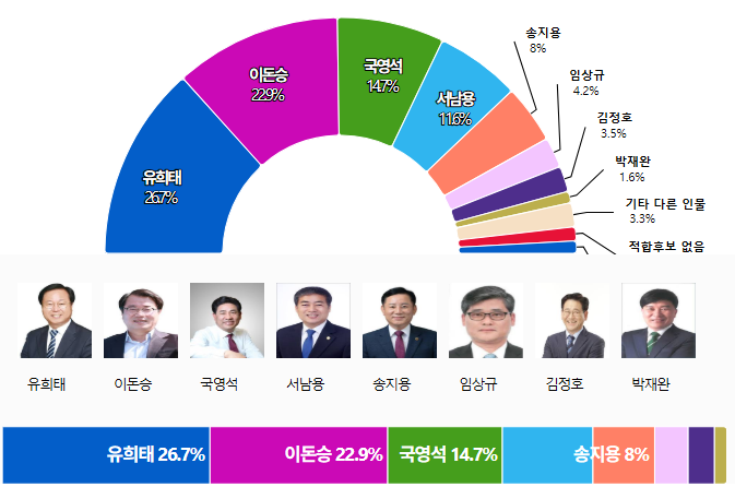 Á¶»ç±â°ü Á¶¿ø¾¾¾Ø¾ÆÀ̰¡ 12¿ù 28ÀÏ¿¡¼ 29ÀϱîÁö ÀÌÆ²°£ ½Ç½ÃÇÏ¿© 2ÀÏ ¹ßÇ¥ÇÑ ¡¸Àü¶óºÏµµ ¿ÏÁÖ±º¼ö Èĺ¸ÀûÇÕµµ¡¹¸¦ ¹¯´Â Á¶»ç¿¡¼ ¡¸À¯ÈñÅ¡¹È帰¡ 26.7%¸¦ ±â·ÏÇÏ¿© 2À§ ¡¸À̵·½Â¡¹Èĺ¸(22.9%)¿¡ 3.8%p Â÷ÀÌ·Î ¾Õ¼ ³ª°¡¸ç, µÚ¸¦ ÀÌ¾î ¡¸±¹¿µ¼®¡¹Èĺ¸ 14.7%, ¡¸¼³²¿ë¡¹Èĺ¸ 11.6%, ¡¸¼ÛÁö¿ë¡¹Èĺ¸ 8%, ¡¸ÀÓ»ó±Ô¡¹Èĺ¸ 4.2%, ¡¸±èÁ¤È£¡¹Èĺ¸ 3.5%, ¡¸¹ÚÀç¿Ï¡¹Èĺ¸ 1.6%¸¦ ±â·ÏÇÏ¿´´Ù.