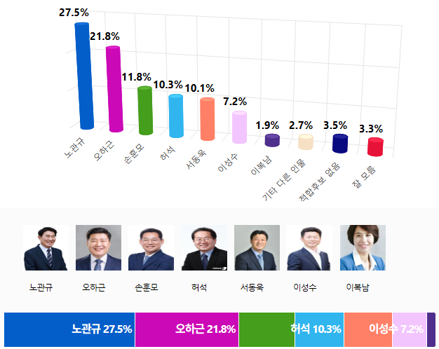 Á¶»ç±â°ü Á¶¿ø¾¾¾Ø¾ÆÀ̰¡ 1¿ù 24ÀÏ¿¡¼ 25ÀϱîÁö ÀÌÆ²°£ ½Ç½ÃÇÏ¿© 27ÀÏ ¹ßÇ¥ÇÑ ¡¸¼øÃµ½ÃÀå Èĺ¸ ÀûÇÕµµ¡¹¸¦ ¹¯´Â Á¶»ç¿¡¼ ¡¸³ë°ü±Ô¡¹È帴 27.5%·Î 1À§¸¦, ¡¸¿ÀÇϱ١¹È帴 21.8%·Î 2À§¸¦, ¡¸¼ÕÈÆ¸ð¡¹È帴 11.8%·Î 3À§¸¦, ¡¸Çã¼®¡¹È帴 10.3%·Î 4À§¸¦, ¡¸¼µ¿¿í¡¹È帴 10.1%·Î 5À§¸¦, ¡¸À̼º¼ö¡¹È帴 7.2%·Î 6À§¸¦, ¡¸À̺¹³²¡¹È帴 1.9%·Î 7À§¸¦ ÇÏ´Â °ÍÀ¸·Î ±â·ÏµÇ¾ú´Ù.