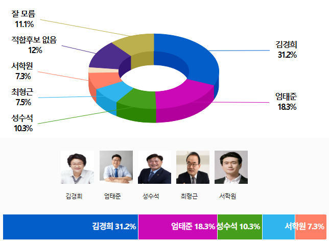 Á¦9ȸ Àü±¹µ¿½ÃÁö¹æ¼±°Å¸¦ 129ÀÏ ¾ÕµÎ°í ½Ç½ÃµÈ ¡¸ÀÌõ½ÃÀå Èĺ¸ ÀûÇÕµµ¡¹¿©·ÐÁ¶»ç¿¡¼ '±è°æÈñ' Èĺ¸ 31.2%,'¾öÅÂÁØ' Èĺ¸ 18.3%·Î ³ª¿Ô´Ù.