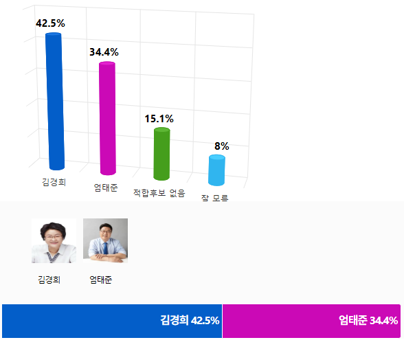 Á¦9ȸ Àü±¹µ¿½ÃÁö¹æ¼±°Å¸¦ 129ÀÏ ¾ÕµÎ°í ½Ç½ÃµÈ ¡¸ÀÌõ½ÃÀå °¡»ó´ë°á : ±è°æÈñ vs. ¾öÅÂÁØ¡¹Á¶»ç¿¡¼ '±è°æÈñ' È帰¡ 42.5%¸¦ ¾ò¾î 34.4%¸¦ ¾òÀº '¾öÅÂÁØ' Èĺ¸¿Í 8.1%Æ÷ÀÎÆ® Â÷ÀÌ·Î ¿ÀÂ÷¹üÀ§³» Á¢ÀüÀ» º¸¿´´Ù.