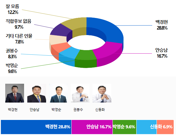 Á¶»ç±â°ü Á¶¿ø¾¾¾Ø¾ÆÀ̰¡ 1¿ù 24ÀÏ¿¡¼ 25ÀϱîÁö ÀÌÆ²°£ ½Ç½ÃÇÏ¿© 27ÀÏ ¹ßÇ¥ÇÑ ¡¸±¸¸®½ÃÀå Èĺ¸ ÀûÇÕµµ¡¹¸¦ ¹¯´Â Á¶»ç¿¡¼ ¡¸¹é°æÇö¡¹È帴 28.8%·Î 1À§¸¦, ¡¸¾È½Â³²¡¹È帴 16.7%·Î 2À§¸¦, ¡¸¹Ú¿µ¼ø¡¹È帴 9.6%·Î 3À§¸¦, ¡¸±ÇºÀ¼ö¡¹È帴 8.3%·Î 4À§¸¦, ¡¸½Åµ¿È¡¹È帴 6.9%·Î 5À§¸¦ ÇÏ´Â °ÍÀ¸·Î ±â·ÏµÇ¾ú´Ù.