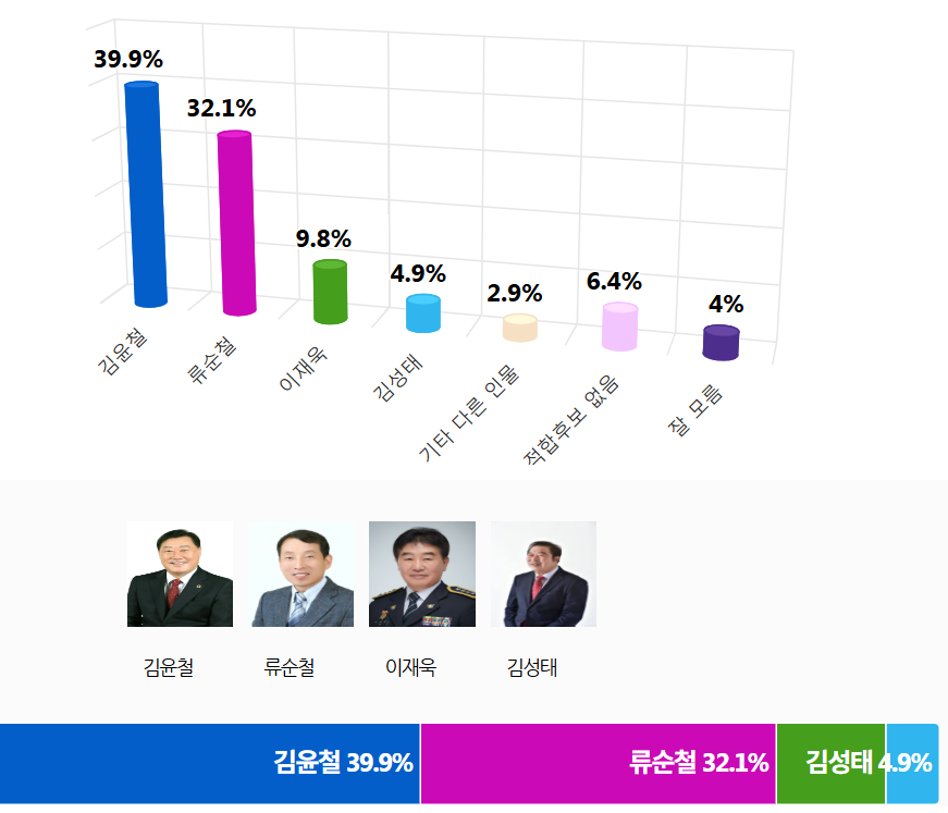Á¦9ȸ Àü±¹µ¿½ÃÁö¹æ¼±°Å¸¦ 127ÀÏ ¾ÕµÎ°í ½Ç½ÃµÈ ¡¸ÇÕõ±º¼ö Èĺ¸ ÀûÇÕµµ¡¹Á¶»ç¿¡¼ '±èÀ±Ã¶' È帰¡ 39.9%¸¦ ¾ò¾î 32.1%¸¦ ¾òÀº '·ù¼øÃ¶' Èĺ¸¿Í 7.8%Æ÷ÀÎÆ® Â÷ÀÌ·Î ¿ÀÂ÷¹üÀ§³» Á¢ÀüÀ» ±â·ÏÇß´Ù.