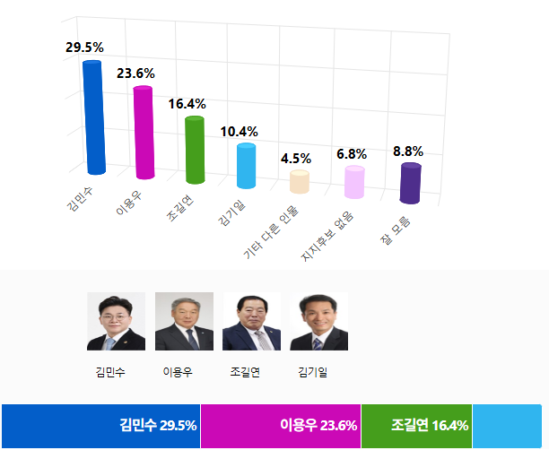Á¦9ȸ Àü±¹µ¿½ÃÁö¹æ¼±°Å¸¦ 132ÀÏ ¾ÕµÎ°í ½Ç½ÃµÈ ¡¸ºÎ¿©±º¼ö Èĺ¸ÁöÁöµµ¡¹Á¶»ç¿¡¼ ±è¹Î¼ö Çö Ãæ³²µµÀÇȸ ÀÇ¿øÀÌ 29.5%¸¦ ¾ò¾î 23.6%¸¦ ¾òÀº ÀÌ¿ë¿ì Àü ºÎ¿©±º¼ö¿Í 5.9%Æ÷ÀÎÆ® Â÷ÀÌ·Î ¿ÀÂ÷¹üÀ§³» Á¢ÀüÀ» ±â·ÏÇß´Ù.