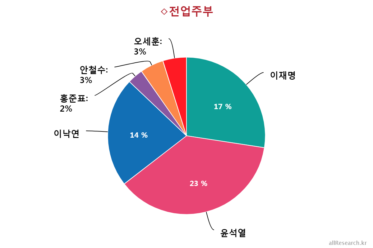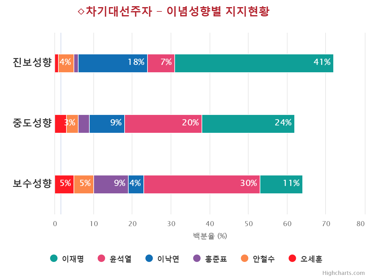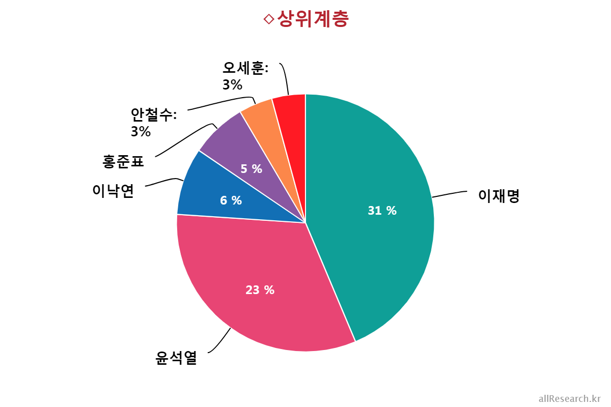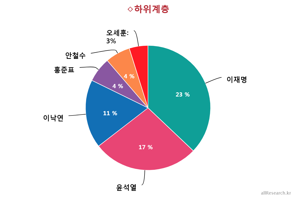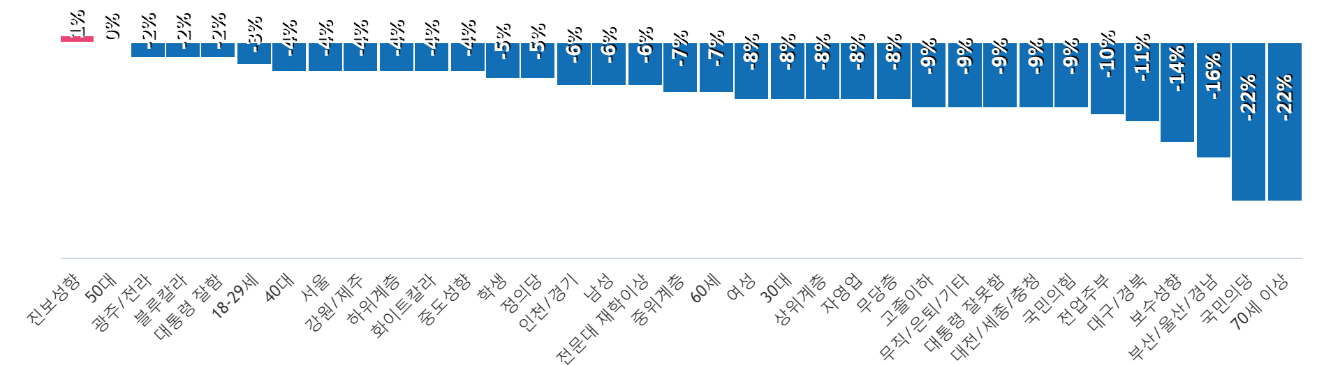 À±¼®¿­ Èĺ¸ÀÇ ÁöÁöÀ² Ç϶ôÀ» ÁÖµµÇÑ ÀÀ´äÃþÀº ±¹¹ÎÀÇ´ç(39.0%¡æ17.0%,¡å22.0%), 70¼¼ ÀÌ»ó(41.0%¡æ19.0%,¡å22.0%), ºÎ»ê/¿ï»ê/°æ³²(28.0%¡æ12.0%,¡å16.0%), º¸¼ö¼ºÇâ(44.0%¡æ30.0%,¡å14.0%), ´ë±¸/°æºÏ(43.0%¡æ32.0%,¡å11.0%), Àü¾÷ÁÖºÎ(33.0%¡æ23.0%,¡å10.0%), ´ëÅë·É À߸øÇÔ(41.0%¡æ32.0%,¡å9.0%), °íÁ¹ÀÌÇÏ(30.0%¡æ21.0%,¡å9.0%), ±¹¹ÎÀÇÈû(58.0%¡æ49.0%,¡å9.0%), ´ëÀü/¼¼Á¾/ÃæÃ»(21.0%¡æ12.0%,¡å9.0%), »óÀ§°èÃþ(31.0%¡æ23.0%,¡å8.0%), ÀÚ¿µ¾÷(35.0%¡æ27.0%,¡å8.0%), ¹«´çÃþ(19.0%¡æ11.0%,¡å8.0%), 30´ë(19.0%¡æ11.0%,¡å8.0%), ¿©¼º(24.0%¡æ16.0%,¡å8.0%), ÁßÀ§°èÃþ(24.0%¡æ17.0%,¡å7.0%), 60¼¼(45.0%¡æ38.0%,¡å7.0%), Àü¹®´ë ÀçÇÐÀÌ»ó(22.0%¡æ16.0%,¡å6.0%), ÀÎõ/°æ±â(24.0%¡æ18.0%,¡å6.0%), ³²¼º(26.0%¡æ20.0%,¡å6.0%), Çлý(12.0%¡æ7.0%,¡å5.0%), Á¤ÀÇ´ç(13.0%¡æ8.0%,¡å5.0%), ÇÏÀ§°èÃþ(21.0%¡æ17.0%,¡å4.0%), È­ÀÌÆ®Ä®¶ó(18.0%¡æ14.0%,¡å4.0%), Áßµµ¼ºÇâ(24.0%¡æ20.0%,¡å4.0%), °­¿ø/Á¦ÁÖ(16.0%¡æ12.0%,¡å4.0%), ¼­¿ï(27.0%¡æ23.0%,¡å4.0%), 40´ë(17.0%¡æ13.0%,¡å4.0%), 18-29¼¼(11.0%¡æ8.0%,¡å3.0%), ´ëÅë·É ÀßÇÔ(3.0%¡æ1.0%,¡å2.0%), ºí·çÄ®¶ó(20.0%¡æ18.0%,¡å2.0%), ±¤ÁÖ/Àü¶ó(7.0%¡æ5.0%,¡å2.0%)¼øÀ¸·Î ´ëºÎºÐÀÇ ÀÀ´äÃþ¿¡¼­ Ç϶ô¼¼¸¦ º¸¿´´Ù.