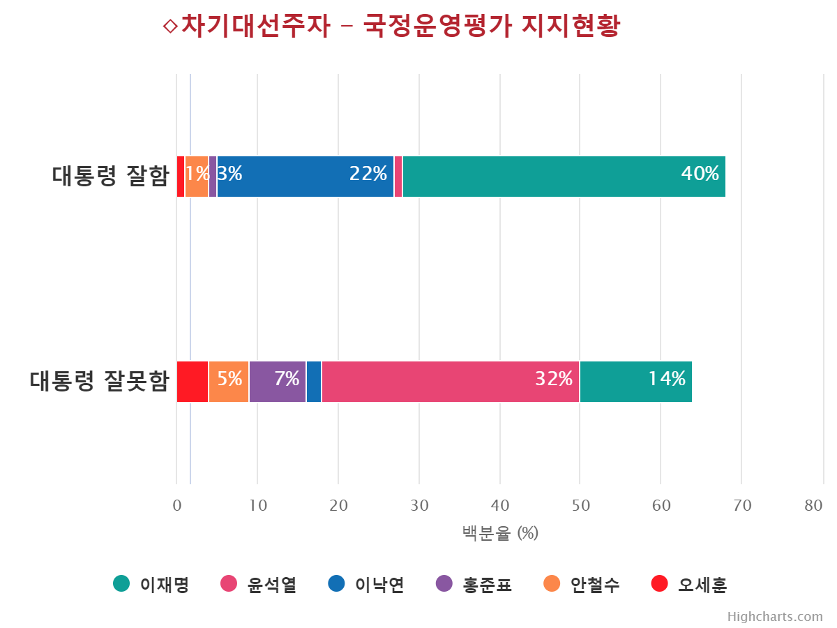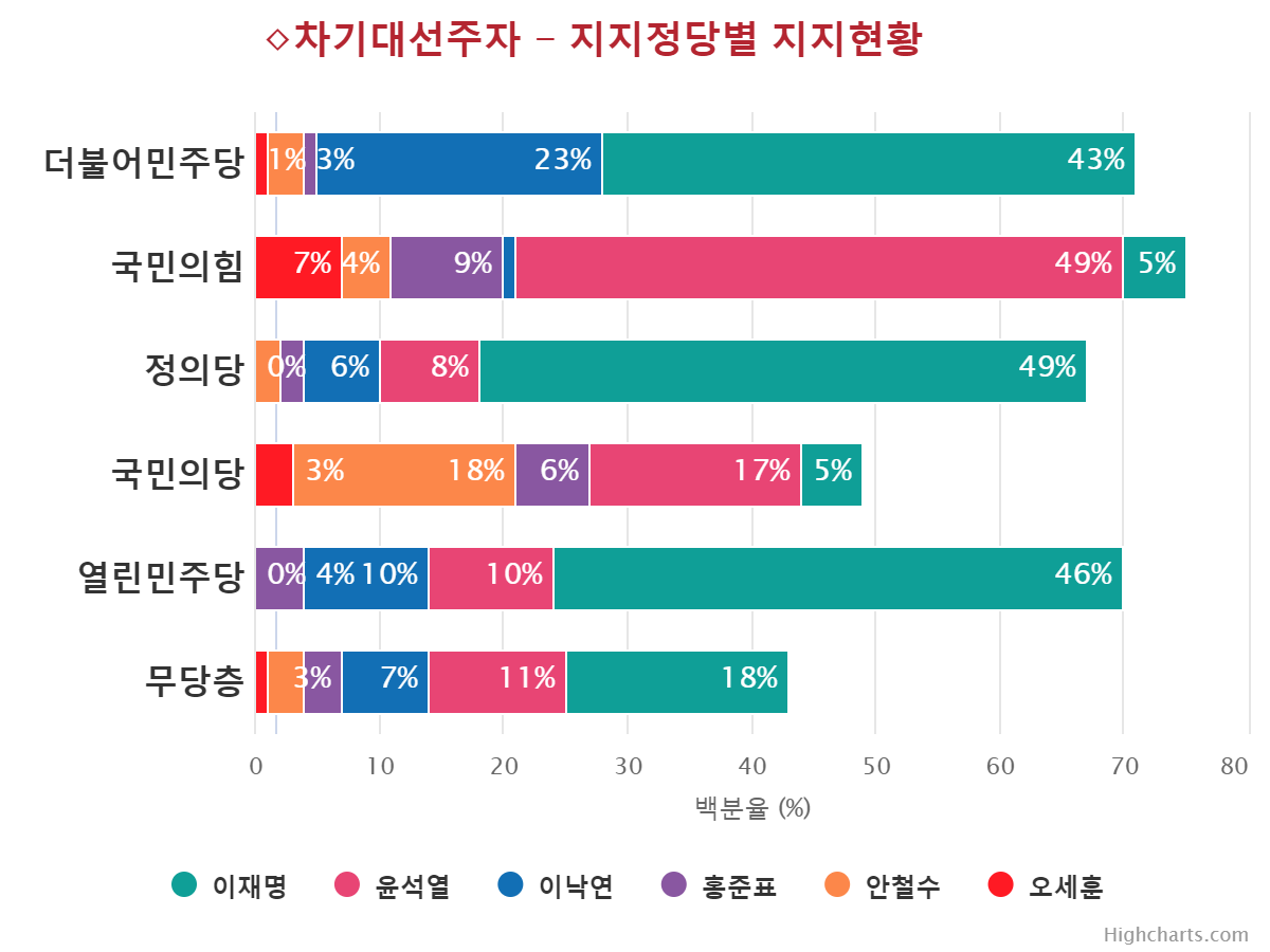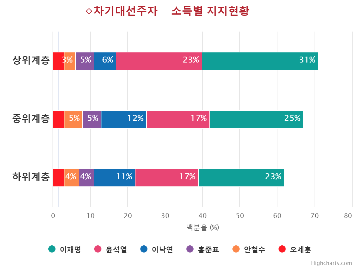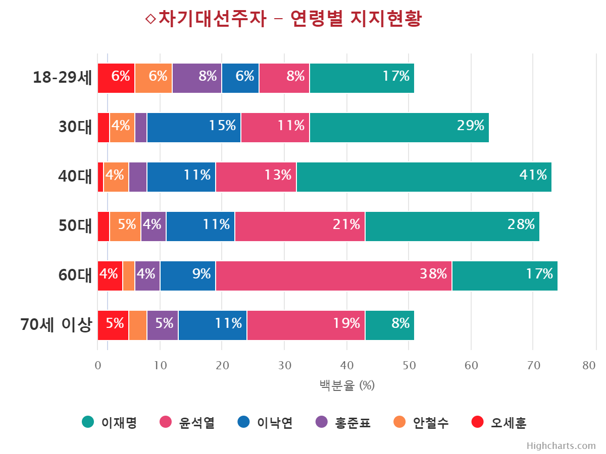 À±¼®¿­ Èĺ¸ÀÇ ÁöÁöÀ² Ç϶ôÀ» ÁÖµµÇÑ ÀÀ´äÃþÀº ±¹¹ÎÀÇ´ç(39.0%¡æ17.0%,¡å22.0%), 70¼¼ ÀÌ»ó(41.0%¡æ19.0%,¡å22.0%), ºÎ»ê/¿ï»ê/°æ³²(28.0%¡æ12.0%,¡å16.0%), º¸¼ö¼ºÇâ(44.0%¡æ30.0%,¡å14.0%), ´ë±¸/°æºÏ(43.0%¡æ32.0%,¡å11.0%), Àü¾÷ÁÖºÎ(33.0%¡æ23.0%,¡å10.0%), ´ëÅë·É À߸øÇÔ(41.0%¡æ32.0%,¡å9.0%), °íÁ¹ÀÌÇÏ(30.0%¡æ21.0%,¡å9.0%), ±¹¹ÎÀÇÈû(58.0%¡æ49.0%,¡å9.0%), ´ëÀü/¼¼Á¾/ÃæÃ»(21.0%¡æ12.0%,¡å9.0%), »óÀ§°èÃþ(31.0%¡æ23.0%,¡å8.0%), ÀÚ¿µ¾÷(35.0%¡æ27.0%,¡å8.0%), ¹«´çÃþ(19.0%¡æ11.0%,¡å8.0%), 30´ë(19.0%¡æ11.0%,¡å8.0%), ¿©¼º(24.0%¡æ16.0%,¡å8.0%), ÁßÀ§°èÃþ(24.0%¡æ17.0%,¡å7.0%), 60¼¼(45.0%¡æ38.0%,¡å7.0%), Àü¹®´ë ÀçÇÐÀÌ»ó(22.0%¡æ16.0%,¡å6.0%), ÀÎõ/°æ±â(24.0%¡æ18.0%,¡å6.0%), ³²¼º(26.0%¡æ20.0%,¡å6.0%), Çлý(12.0%¡æ7.0%,¡å5.0%), Á¤ÀÇ´ç(13.0%¡æ8.0%,¡å5.0%), ÇÏÀ§°èÃþ(21.0%¡æ17.0%,¡å4.0%), È­ÀÌÆ®Ä®¶ó(18.0%¡æ14.0%,¡å4.0%), Áßµµ¼ºÇâ(24.0%¡æ20.0%,¡å4.0%), °­¿ø/Á¦ÁÖ(16.0%¡æ12.0%,¡å4.0%), ¼­¿ï(27.0%¡æ23.0%,¡å4.0%), 40´ë(17.0%¡æ13.0%,¡å4.0%), 18-29¼¼(11.0%¡æ8.0%,¡å3.0%), ´ëÅë·É ÀßÇÔ(3.0%¡æ1.0%,¡å2.0%), ºí·çÄ®¶ó(20.0%¡æ18.0%,¡å2.0%), ±¤ÁÖ/Àü¶ó(7.0%¡æ5.0%,¡å2.0%)¼øÀ¸·Î ´ëºÎºÐÀÇ ÀÀ´äÃþ¿¡¼­ Ç϶ô¼¼¸¦ º¸¿´´Ù.