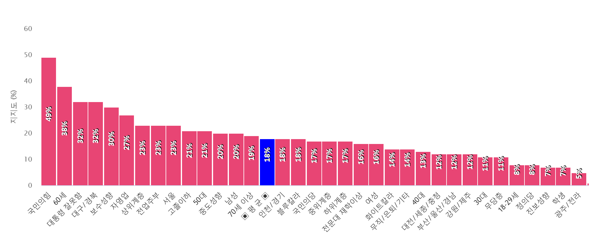 ±¹¹ÎÀÇÈû 49% > 60¼¼ 38% > ´ë±¸/°æºÏ 32% ¼øÀ¸·Î ÁöÁö ¹Þ¾Æ