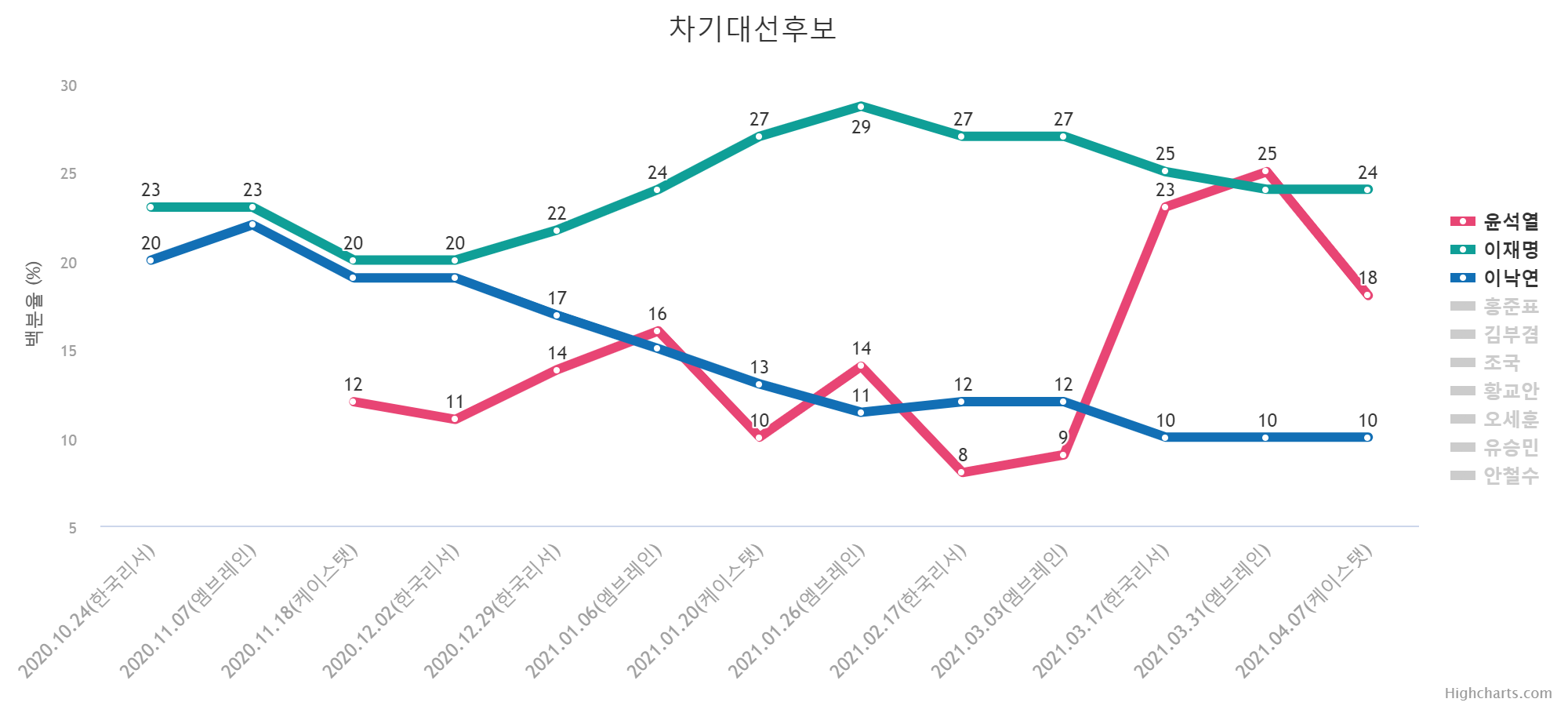 ¡ã Áö³­ 6°³¿ù Â÷±â´ë¼±Èĺ¸ ÁöÁöµµ ÇöȲ (4°³ ±â°ü ¿¬ÇÕ)