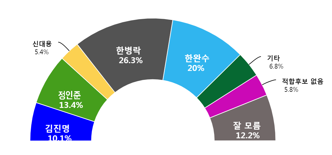 ÇѺ´¶ô(26.3%),Çѿϼö(20%), Á¤ÀÎÁØ(13.4%), ±èÁø¸í(10.1%), ½Å´ë¿ë(5.4%) â÷