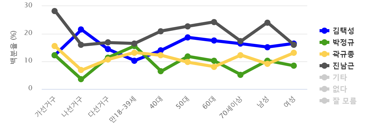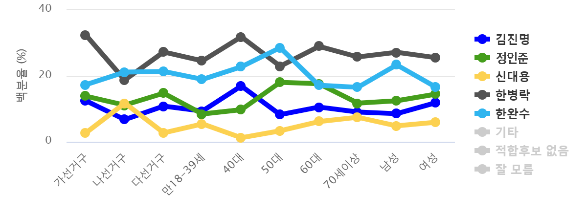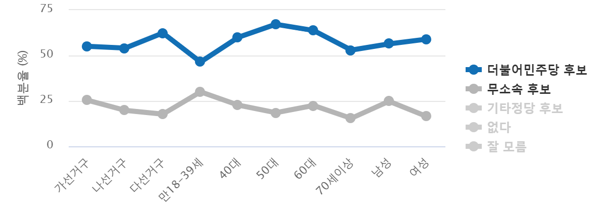 Áö¿ªº° ÀÀ´ä¿¡¼ "°¡¼±°Å±¸"Áö¿ªÀº¡¸´õºÒ¾î¹ÎÁÖ´ç Èĺ¸¡¹(55.1%),¡¸¹«¼Ò¼Ó Èĺ¸¡¹(25.4%),¡¸Àß ¸ð¸§¡¹(10%)À̸ç, "³ª¼±°Å±¸"Áö¿ªÀº¡¸´õºÒ¾î¹ÎÁÖ´ç Èĺ¸¡¹(54.1%),¡¸¹«¼Ò¼Ó Èĺ¸¡¹(19.8%),¡¸Àß ¸ð¸§¡¹(17.6%), "´Ù¼±°Å±¸"Áö¿ªÀº¡¸´õºÒ¾î¹ÎÁÖ´ç Èĺ¸¡¹(62.4%),¡¸¹«¼Ò¼Ó Èĺ¸¡¹(17.7%),¡¸Àß ¸ð¸§¡¹(10.7%)·Î ³ªÅ¸³µ´Ù.