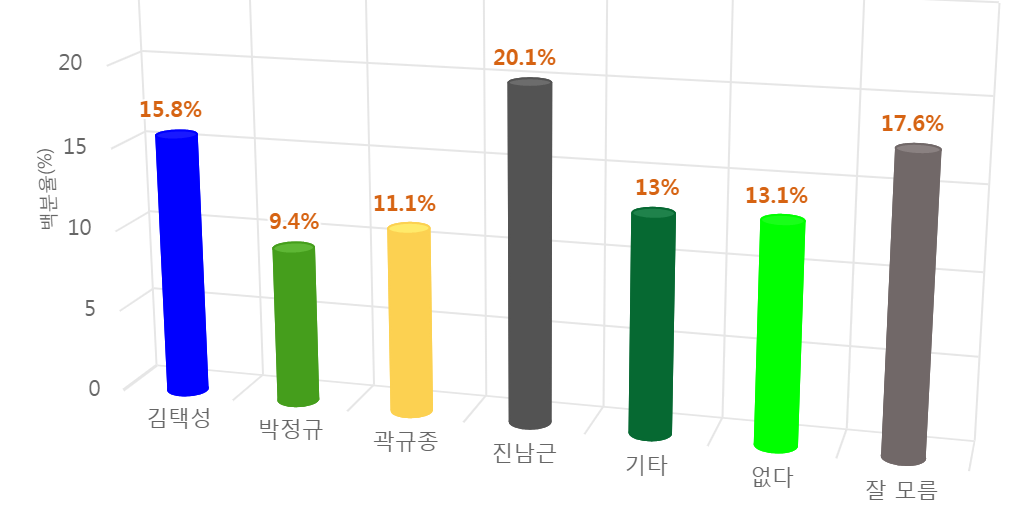 Çѿϼö Çö ÀüºÏµµÀÇ¿øÀº 20%·Î 2À§, Á¤ÀÎÁØ Çö ÀӽDZº »ê¸²Á¶ÇÕÀåÀÌ 13.4%·Î 3À§, ±èÁø¸í Àü ÀüºÏµµÀÇ¿øÀÌ 10.1%·Î 4À§, ½Å´ë¿ë Çö ÀӽDZº ÀÇȸ ÀÇ¿øÀÌ 5.4%·Î 5À§¸¦ ÇÏ´Â °ÍÀ¸·Î °á°ú°¡ ³ª¿Ô´Ù.