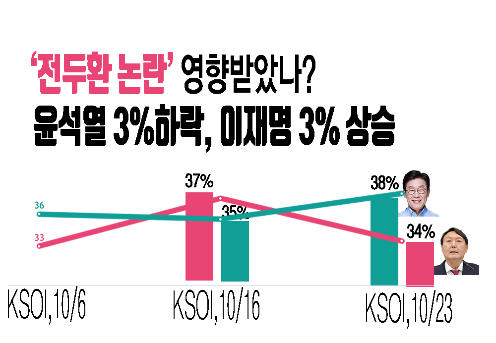 • Á¶»ç±â°ü ÄÉÀÌ¿¡½º¿À¾ÆÀÌ ÁÖ½Äȸ»ç(Çѱ¹»çȸ¿©·Ð¿¬±¸¼Ò)°¡(ÀÌ) ¾ð·Ð»ç TBS ÀÇ·Ú·Î 10¿ù 22ÀÏ~23ÀϱîÁö ½Ç½ÃÇÏ¿© 25ÀÏ ¹ßÇ¥ÇÑ ÀÌÀç¸í Èĺ¸¿Í À±¼®¿­ Àü ÃÑÀå °¡»ó ¾çÀÚ´ë°áÁ¶»ç¿¡¼­ À±¼®¿­ Àü ÃÑÀåÀº Áö³­ÁÖº¸´Ù 3% Ç϶ôÇÑ 33.6%, ÀÌÀç¸í È帴 3% »ó½ÂÇÑ 37.5%·Î ³ª¿Ô´Ù.