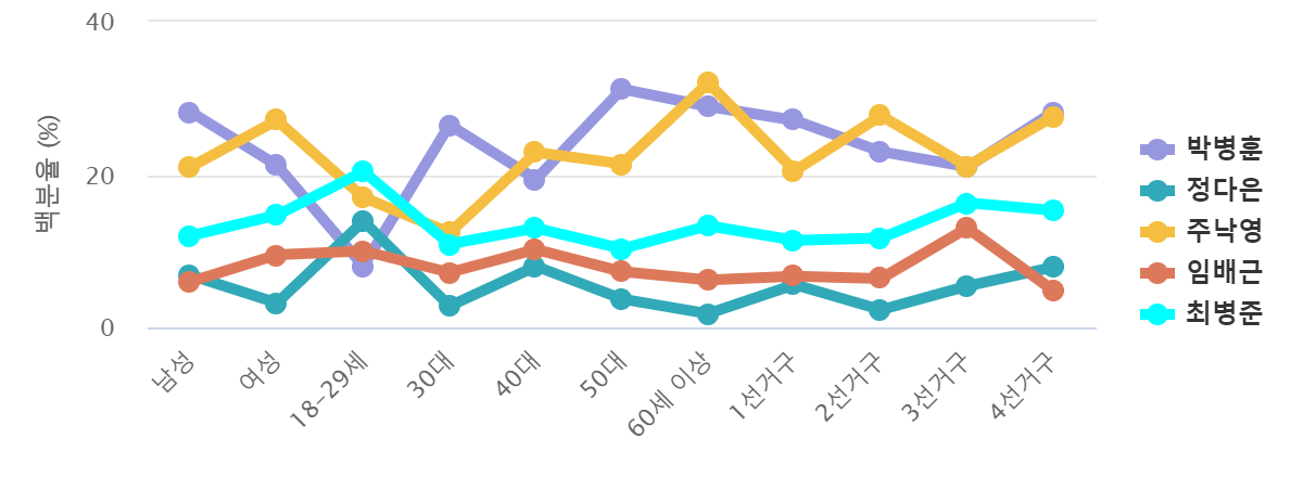 Áö¿ªº° ÁöÁöµµ ºÐ¼®¿¡¼­ "¹Úº´ÈÆ" È帴 4¼±°Å±¸(¼­¸é °ÇõÀ¾ »ê³»¸é ³»³²¸é ¼±µµµ¿ Ȳ³²µ¿ ¿ù¼ºµ¿)(28.2%), 1¼±°Å±¸(Ȳ¼ºµ¿ ¼º°Çµ¿ Áߺε¿ Çö°î¸é Ȳ¿Àµ¿)(27.1%), 2¼±°Å±¸(µ¿Ãµµ¿ ºÒ±¹µ¿ ¾ç³²¸é ¾çºÏ¸é °¨Æ÷À¾ º¸´öµ¿ ¿Üµ¿À¾)(23%)Áö¿ª ¼øÀ¸·Î, "Á¤´ÙÀº" È帴 4¼±°Å±¸(¼­¸é °ÇõÀ¾ »ê³»¸é ³»³²¸é ¼±µµµ¿ Ȳ³²µ¿ ¿ù¼ºµ¿)(7.9%), 1¼±°Å±¸(Ȳ¼ºµ¿ ¼º°Çµ¿ Áߺε¿ Çö°î¸é Ȳ¿Àµ¿)(5.6%), 3¼±°Å±¸(¾È°­À¾ °­µ¿¸é õºÏ¸é ¿ë°­µ¿)(5.4%)Áö¿ª ¼øÀ¸·Î, "ÁÖ³«¿µ" È帴 2¼±°Å±¸(µ¿Ãµµ¿ ºÒ±¹µ¿ ¾ç³²¸é ¾çºÏ¸é °¨Æ÷À¾ º¸´öµ¿ ¿Üµ¿À¾)(27.7%), 4¼±°Å±¸(¼­¸é °ÇõÀ¾ »ê³»¸é ³»³²¸é ¼±µµµ¿ Ȳ³²µ¿ ¿ù¼ºµ¿)(27.6%), 3¼±°Å±¸(¾È°­À¾ °­µ¿¸é õºÏ¸é ¿ë°­µ¿)(21.1%)Áö¿ª ¼øÀ¸·Î, "ÀÓ¹è±Ù" È帴 3¼±°Å±¸(¾È°­À¾ °­µ¿¸é õºÏ¸é ¿ë°­µ¿)(13%), 1¼±°Å±¸(Ȳ¼ºµ¿ ¼º°Çµ¿ Áߺε¿ Çö°î¸é Ȳ¿Àµ¿)(6.7%), 2¼±°Å±¸(µ¿Ãµµ¿ ºÒ±¹µ¿ ¾ç³²¸é ¾çºÏ¸é °¨Æ÷À¾ º¸´öµ¿ ¿Üµ¿À¾)(6.4%)Áö¿ª ¼øÀ¸·Î, "ÃÖº´ÁØ" È帴 3¼±°Å±¸(¾È°­À¾ °­µ¿¸é õºÏ¸é ¿ë°­µ¿)(16.3%), 4¼±°Å±¸(¼­¸é °ÇõÀ¾ »ê³»¸é ³»³²¸é ¼±µµµ¿ Ȳ³²µ¿ ¿ù¼ºµ¿)(15.3%), 2¼±°Å±¸(µ¿Ãµµ¿ ºÒ±¹µ¿ ¾ç³²¸é ¾çºÏ¸é °¨Æ÷À¾ º¸´öµ¿ ¿Üµ¿À¾)(11.7%)Áö¿ª ¼øÀ¸·Î, "±âŸÀι°" È帴 Áö¿ª ¼øÀ¸·Î °­¼¼¸¦ º¸ÀÌ´Â °ÍÀ¸·Î ³ªÅ¸³µ´Ù.