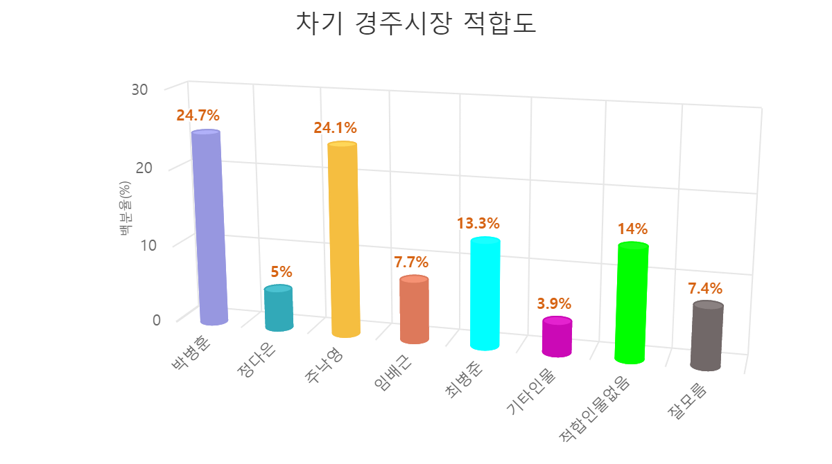 ¡ã Â÷±â °æÁÖ½ÃÀå Èĺ¸ ÀûÇÕµµ ¢¹¡¸¹Úº´ÈÆ¡¹24.7%,¡¸ÁÖ³«¿µ¡¹24.1%,¡¸ÃÖº´ÁØ¡¹13.3%,¡¸ÀÓ¹è±Ù¡¹7.7%,¡¸Á¤´ÙÀº¡¹5%