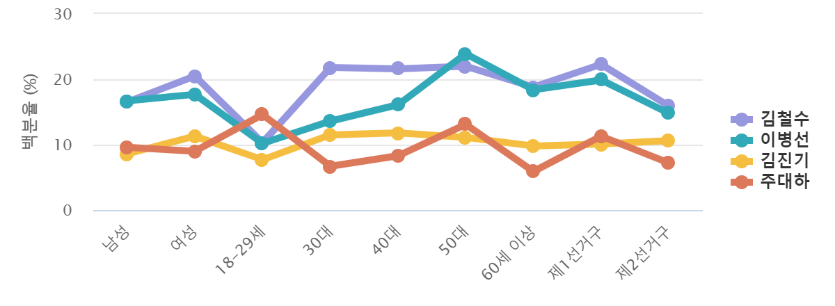 "Á¦1¼±°Å±¸"Áö¿ªÀº ¡¸±èö¼ö¡¹23.8% > ¡¸ÁÖ´ëÇÏ¡¹20.5% , "Á¦2¼±°Å±¸"Áö¿ªÀº ¡¸±èö¼ö¡¹29.2% > ¡¸ÁÖ´ëÇÏ¡¹18.7% ¼øÀ¸·Î ³ªÅ¸³µ´Ù.