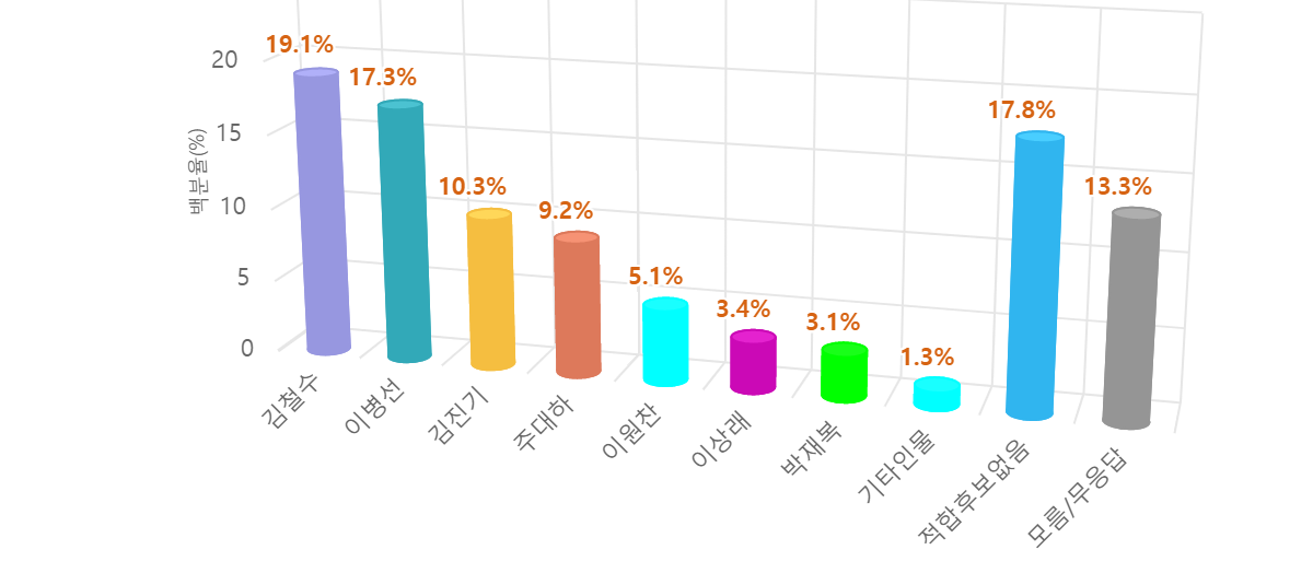 ¡ãÂ÷±â ¼ÓÃʽÃÀå ¿©¾ß Èĺ¸ ÀûÇÕµµ ¢¹¡¸±èö¼ö¡¹19.1%,¡¸À̺´¼±¡¹17.3%,¡¸±èÁø±â¡¹10.3%,¡¸ÁÖ´ëÇÏ¡¹9.2%,¡¸ÀÌ¿øÂù¡¹5.1%,¡¸À̻󷡡¹3.4%,¡¸¹ÚÀ纹¡¹3.1%¼ø