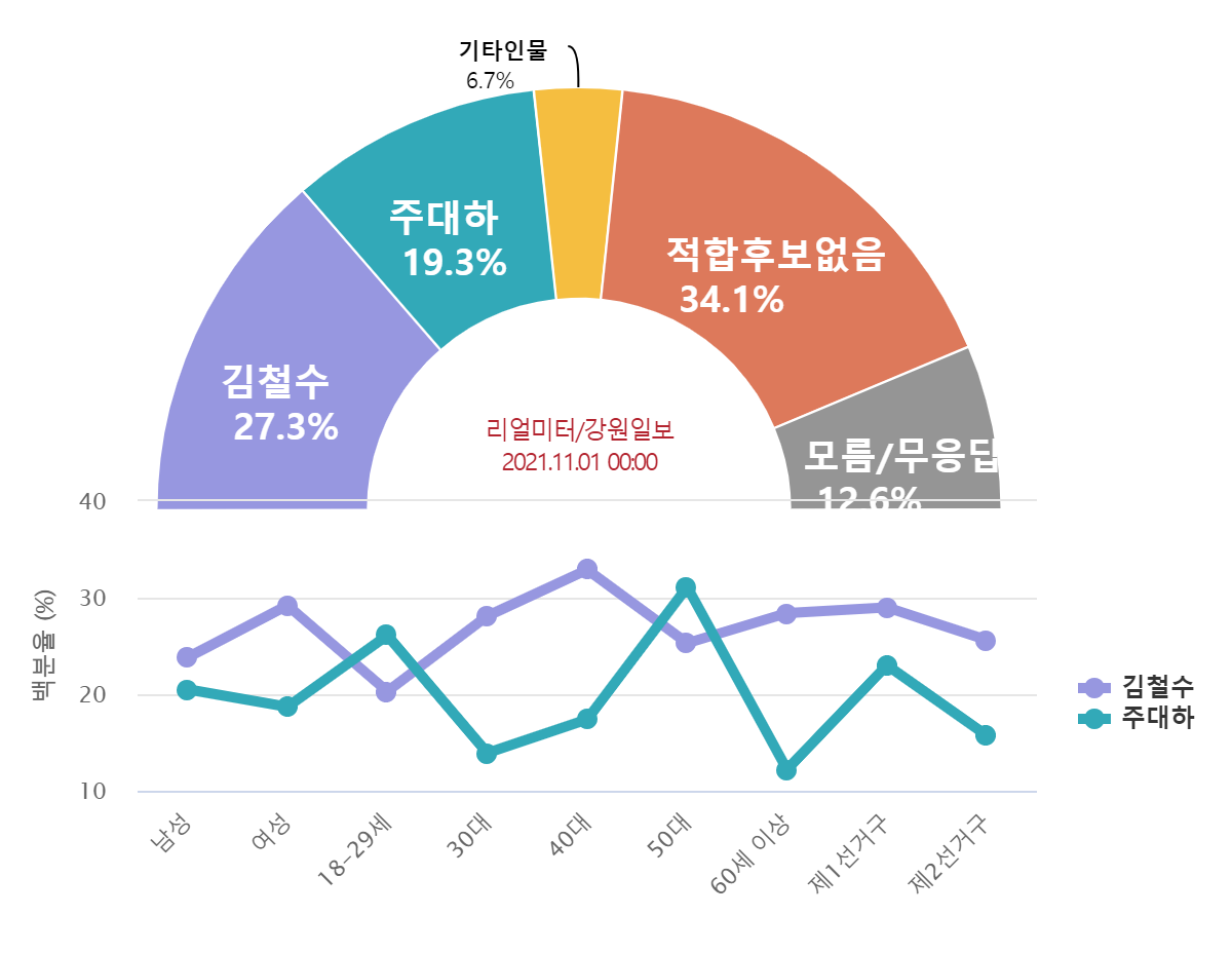 "³²¼º"´Â ¡¸±èö¼ö¡¹29.0% > ¡¸ÁÖ´ëÇÏ¡¹23.0% , "¿©¼º"´Â ¡¸±èö¼ö¡¹25.6% > ¡¸ÁÖ´ëÇÏ¡¹15.7% ¼øÀ¸·Î ÀÀ´äµÇ¾ú´Ù.