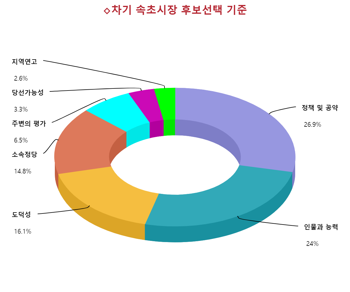 ¡ãÂ÷±â ¼ÓÃʽÃÀå Èĺ¸¼±Åà ±âÁØ ¡¸Á¤Ã¥ ¹× °ø¾à¡¹26.9%,¡¸Àι°°ú ´É·Â¡¹24%,¡¸µµ´ö¼º¡¹16.1%,¡¸¼Ò¼ÓÁ¤´ç¡¹14.8%,¡¸ÁÖº¯ÀÇ Æò°¡¡¹6.5%,¡¸´ç¼±°¡´É¼º¡¹3.3%,¡¸Áö¿ª¿¬°í¡¹2.6%¼ø