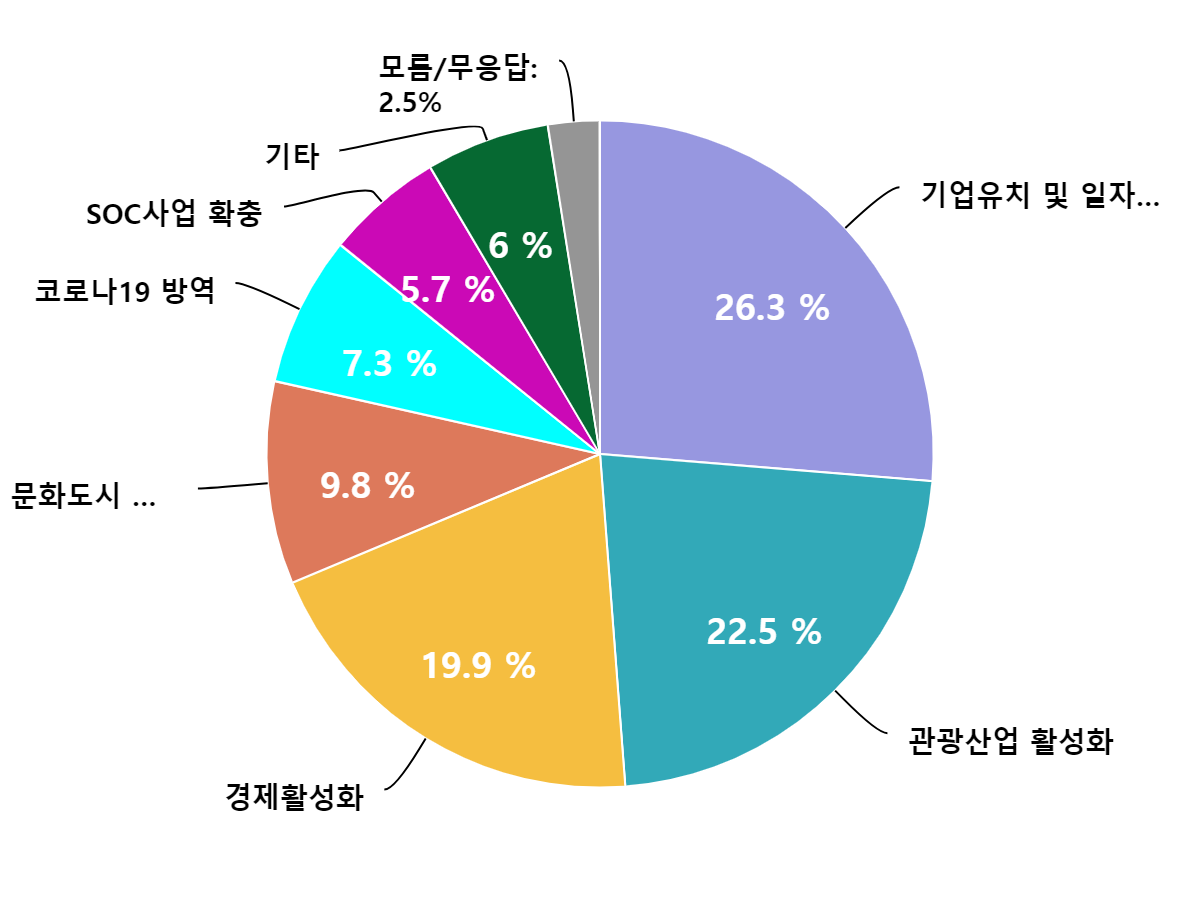 ¼ÓÃʽà ¿ªÁ¡ °úÁ¦¸¦ Á¶»çÇÑ °á°ú ¡¸±â¾÷À¯Ä¡ ¹× ÀÏÀÚ¸® âÃ⡹26.3%, °ü±¤»ê¾÷ Ȱ¼ºÈ 22.5%·Î »óÀ§¸¦ Â÷ÁöÇÏ¿´À¸¸ç, µÚ¸¦ ÀÌ¾î ¡¸°æÁ¦È°¼ºÈ¡¹19.9%,¡¸¹®Èµµ½Ã À°¼º¡¹9.8%,¡¸Äڷγª19 ¹æ¿ª¡¹7.3%,¡¸SOC»ç¾÷ È®Ãæ¡¹5.7%¼øÀ¸·Î ÀÀ´äµÇ¾ú´Ù.