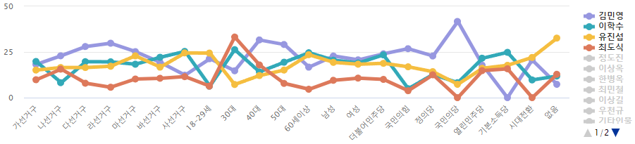 Áö¿ªº° ÀÀ´ä¿¡¼ "°¡¼±°Å±¸"Áö¿ªÀº¡¸ÀÌÇмö¡¹(19.8%),¡¸±è¹Î¿µ¡¹(18.2%),¡¸À¯Áø¼·¡¹(15.1%)À̸ç, "³ª¼±°Å±¸"Áö¿ªÀº¡¸±è¹Î¿µ¡¹(22.9%),¡¸À¯Áø¼·¡¹(16.5%),¡¸ÃÖµµ½Ä¡¹(15.6%), "´Ù¼±°Å±¸"Áö¿ªÀº¡¸±è¹Î¿µ¡¹(28%),¡¸ÀÌÇмö¡¹(19.7%),¡¸À¯Áø¼·¡¹(16.5%), "¶ó¼±°Å±¸"Áö¿ªÀº¡¸±è¹Î¿µ¡¹(29.8%),¡¸ÀÌÇмö¡¹(19.6%),¡¸À¯Áø¼·¡¹(17.2%), "¸¶¼±°Å±¸"Áö¿ªÀº¡¸±è¹Î¿µ¡¹(25.2%),¡¸À¯Áø¼·¡¹(22.9%),¡¸ÀÌÇмö¡¹(18.3%), "¹Ù¼±°Å±¸"Áö¿ªÀº¡¸ÀÌÇмö¡¹(22.1%),¡¸±è¹Î¿µ¡¹(19.3%),¡¸À¯Áø¼·¡¹(16.7%), "»ç¼±°Å±¸"Áö¿ªÀº¡¸ÀÌÇмö¡¹(25.3%),¡¸À¯Áø¼·¡¹(24.5%),¡¸±è¹Î¿µ¡¹(12.3%)¸¦ ±â·ÏÇß´Ù.