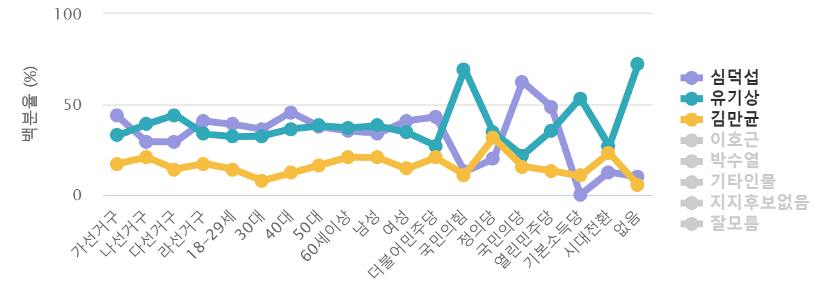 Áö¿ªº° ÀÀ´ä¿¡¼ "°¡¼±°Å±¸"Áö¿ªÀº¡¸½É´ö¼·¡¹(43.5%),¡¸À¯±â»ó¡¹(32.7%),¡¸±è¸¸±Õ¡¹(17.1%)À̸ç, "³ª¼±°Å±¸"Áö¿ªÀº¡¸À¯±â»ó¡¹(38.9%),¡¸½É´ö¼·¡¹(29.3%),¡¸±è¸¸±Õ¡¹(20.8%), "´Ù¼±°Å±¸"Áö¿ªÀº¡¸À¯±â»ó¡¹(44.2%),¡¸½É´ö¼·¡¹(29.2%),¡¸±è¸¸±Õ¡¹(14.2%), "¶ó¼±°Å±¸"Áö¿ªÀº¡¸½É´ö¼·¡¹(40.8%),¡¸À¯±â»ó¡¹(33.6%),¡¸±è¸¸±Õ¡¹(17.3%)¸¦ ±â·ÏÇß´Ù.
