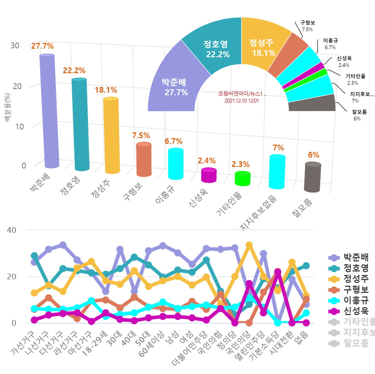 ¡ã±èÁ¦½ÃÀå Èĺ¸ ÁöÁöµµ ¢¹¡¸¹ÚÁع衹27.7%,¡¸Á¤È£¿µ¡¹22.2%,¡¸Á¤¼ºÁÖ¡¹18.1%,¡¸±¸Çüº¸¡¹7.5%,¡¸ÀÌÈ«±Ô¡¹6.7%,¡¸½Å¼º¿í¡¹2.4%¼ø