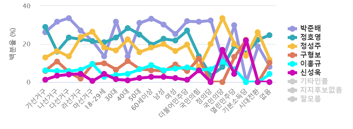 Áö¿ªº° ÀÀ´ä¿¡¼ "°¡¼±°Å±¸"Áö¿ªÀº¡¸Á¤È£¿µ¡¹(28.8%),¡¸¹ÚÁع衹(26.2%),¡¸Á¤¼ºÁÖ¡¹(12.8%)À̸ç, "³ª¼±°Å±¸"Áö¿ªÀº¡¸¹ÚÁع衹(31.6%),¡¸Á¤¼ºÁÖ¡¹(16.4%),¡¸Á¤È£¿µ¡¹(16.1%), "´Ù¼±°Å±¸"Áö¿ªÀº¡¸¹ÚÁع衹(33.6%),¡¸Á¤È£¿µ¡¹(23.4%),¡¸Á¤¼ºÁÖ¡¹(13.4%), "¶ó¼±°Å±¸"Áö¿ªÀº¡¸¹ÚÁع衹(27.1%),¡¸Á¤¼ºÁÖ¡¹(23.6%),¡¸Á¤È£¿µ¡¹(22.5%), "¸¶¼±°Å±¸"Áö¿ªÀº¡¸Á¤¼ºÁÖ¡¹(26.4%),¡¸Á¤È£¿µ¡¹(21.5%),¡¸¹ÚÁع衹(21.5%)·Î ³ªÅ¸³µ´Ù.