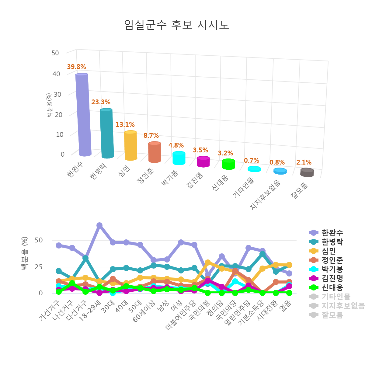 ¾ð·Ð»ç ´º½º1 ÀüºÏÃëÀ纻ºÎ ÀÇ·Ú·Î 12¿ù 10ÀÏ~11ÀÏ ÀÌÆ²°£ ½Ç½ÃÇÏ¿© 13ÀÏ ¹ßÇ¥ÇÑ ÀӽDZº¼ö Èĺ¸ ÁöÁöµµ¸¦ ¹¯´Â Á¶»ç¿¡¼­ Çѿϼö Çö ÀüºÏµµÀÇ¿øÀÌ 39.8%¸¦ ±â·ÏÇÏ¿© 2À§ ÇѺ´¶ô Çö ¹ÎÁÖ´çÀüºÏµµ´ç ºÎÀ§¿øÀå(23.3%)°ú ¿ÀÂ÷¹üÀ§¸¦ Å©°Ô ¹þ¾î³­ 16.5%Æ÷ÀÎÆ® Â÷ÀÌ·Î 1À§¸¦ ÇÏ´Â °ÍÀ¸·Î ³ªÅ¸³µ´Ù. ½É¹Î Çö ÀӽDZº¼ö´Â 13.1%·Î 3À§¸¦ ±â·ÏÇÏ¿© 2À§¿Íµµ 10.2%Æ÷ÀÎÆ® °ÝÂ÷¸¦ º¸¿´´Ù. µÚ¸¦ À̾î Á¤ÀÎÁØ Çö ÀӽDZº»ê¸²Á¶ÇÕÀåÀÌ 8.7%·Î 4À§, ¹Ú±âºÀ Àü ³²¿øºÎ½ÃÀåÀÌ 4.8%·Î 5À§, ±èÁø¸í Çö ¹ÎÁÖ´çÁ¤Ã¥À§ ºÎÀÇÀåÀÌ 3.5%·Î 6À§, ½Å´ë¿ë Çö ÀӽDZºÀÇ¿øÀÌ 3.2%·Î 7À§¸¦ ÇÏ´Â °ÍÀ¸·Î ³ªÅ¸³µ´Ù.