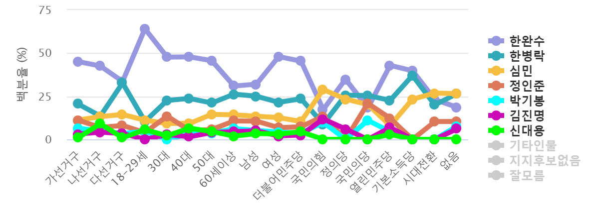 Áö¿ªº° ÀÀ´ä¿¡¼­ "°¡¼±°Å±¸"Áö¿ªÀº¡¸Çѿϼö¡¹(45.1%),¡¸ÇѺ´¶ô¡¹(20.5%),¡¸Á¤ÀÎÁØ¡¹(11.2%)À̸ç, "³ª¼±°Å±¸"Áö¿ªÀº¡¸Çѿϼö¡¹(42.5%),¡¸ÇѺ´¶ô¡¹(13.5%),¡¸½É¹Î¡¹(13.2%), "´Ù¼±°Å±¸"Áö¿ªÀº¡¸Çѿϼö¡¹(33.6%),¡¸ÇѺ´¶ô¡¹(32.7%),¡¸½É¹Î¡¹(14.4%)¸¦ ±â·ÏÇß´Ù.