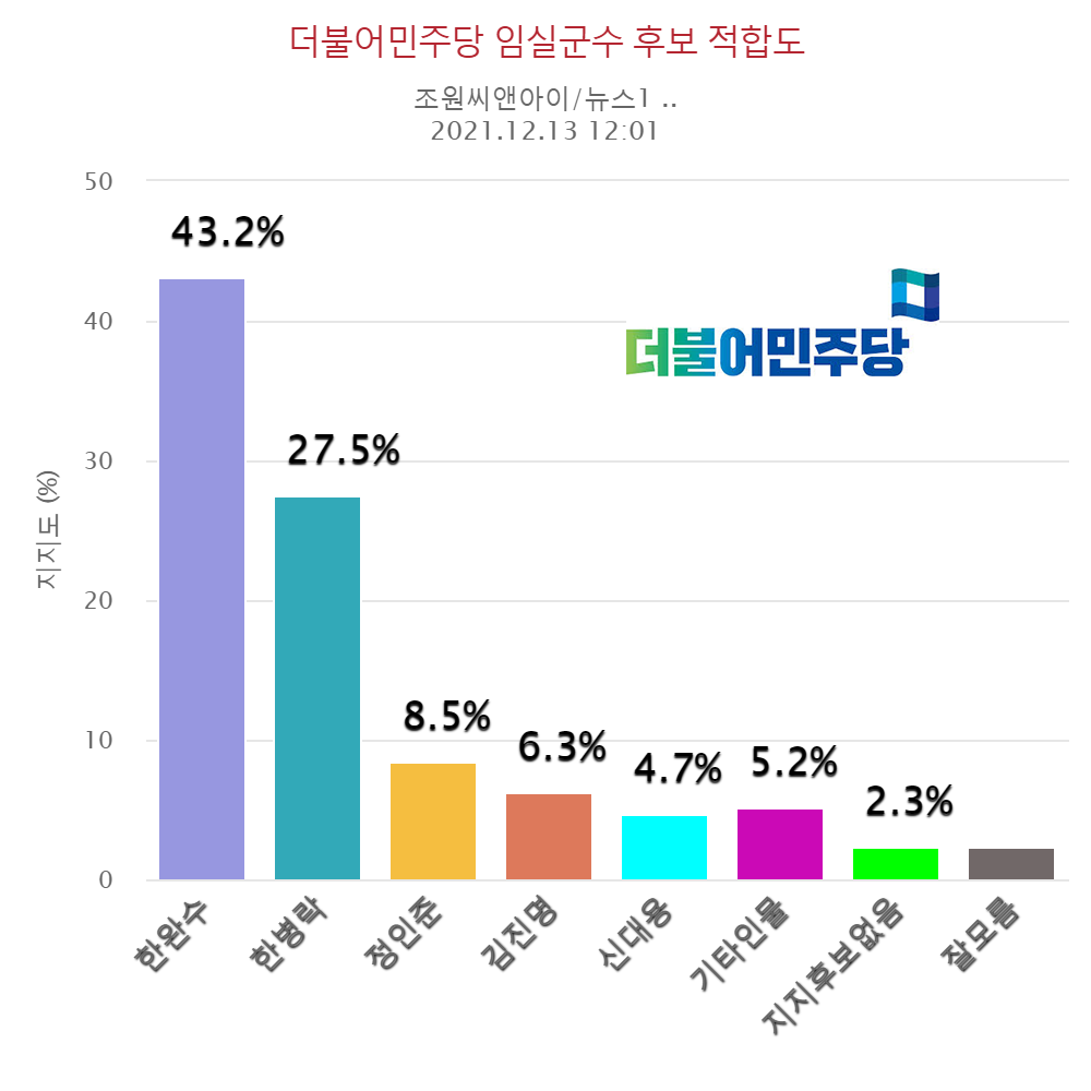 ´õºÒ¾î¹ÎÁÖ´ç ÀӽDZº¼ö Èĺ¸ ÀûÇÕµµ¸¦ Á¶»çÇÑ °á°ú 1À§¿Í 2À§´Â Çѿϼö Çö ÀüºÏµµÀÇ¿ø°ú ÇѺ´¶ô Çö ¹ÎÁÖ´çÀüºÏµµ´ç ºÎÀ§¿øÀåÀÌ ±â·ÏÇÏ¿´À¸¸ç, °¢°¢ 43.2%¿Í 27.5%·Î µÎ È帰£ °ÝÂ÷°¡ 15.7%·Î Áý°èµÇ¾ú´Ù.