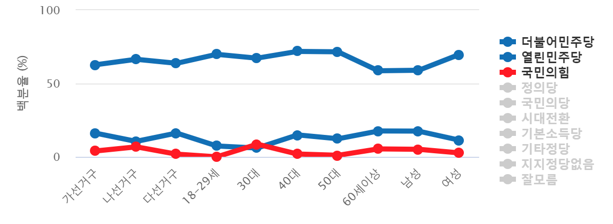 Çѿϼö Çö ÀüºÏµµÀÇ¿øÀº 18-29¼¼(64.1%), ¿©¼º(48%), 40´ë(47.8%), 30´ë(47.7%), 50´ë(45.6%)¼øÀ¸·Î ³ôÀº ÁöÁö¸¦ ¹ÞÀ¸¸ç, ÇѺ´¶ô Çö ¹ÎÁÖ´çÀüºÏµµ´ç ºÎÀ§¿øÀåÀº ±âº»¼Òµæ´ç(37%), ´Ù¼±°Å±¸(32.7%), 60¼¼ÀÌ»ó(26.2%)¼øÀ¸·Î, ½É¹Î Çö ÀӽDZº¼ö´Â ±¹¹ÎÀÇÈû(28.9%), ½Ã´ëÀüȯ(26.8%), ±âº»¼Òµæ´ç(23.3%)¼øÀ¸·Î, Á¤ÀÎÁØ Çö ÀӽDZº»ê¸²Á¶ÇÕÀå´Â ±¹¹ÎÀÇ´ç(20.9%), 30´ë(13.5%), ±¹¹ÎÀÇÈû(13.4%), ¿­¸°¹ÎÁÖ´ç(12.2%)¼øÀ¸·Î, ¹Ú±âºÀ Àü ³²¿øºÎ½ÃÀåÀº ±¹¹ÎÀÇ´ç(11%), ±¹¹ÎÀÇÈû(9.8%)°¡¼±°Å±¸(6.4%)¼øÀ¸·Î , ±èÁø¸í Çö ¹ÎÁÖ´çÁ¤Ã¥À§ ºÎÀÇÀåÀº ±¹¹ÎÀÇÈû(11.8%), ¿­¸°¹ÎÁÖ´ç(6.9%), Á¤ÀÇ´ç(6%), ³²¼º(5%)¼øÀ¸·Î ÁöÁö¸¦ ¹Þ´Â °ÍÀ¸·Î ³ªÅ¸³µ´Ù.